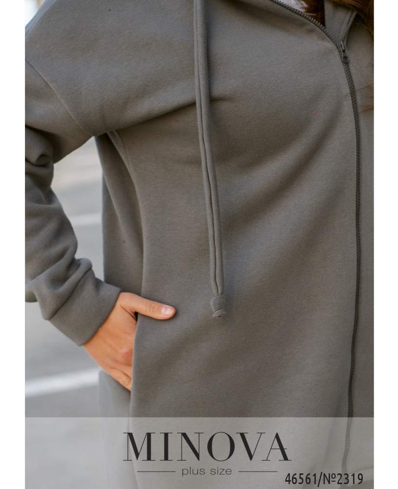 Монохромный утепленный спортивный костюм — идеальный вариант для любителей комфортного минимализма. В комплект входят лаконичные брюки-джоггеры на резинке с карманами в боковых швах, а также удлиненная кофта-туника на змейке с капюшоном и карманами, изюминкой которой являются рукава с манжетами и приспущенной линией плеч и ассиметричный низ, удлиненный по спинке.