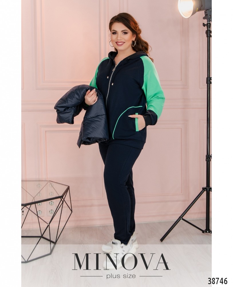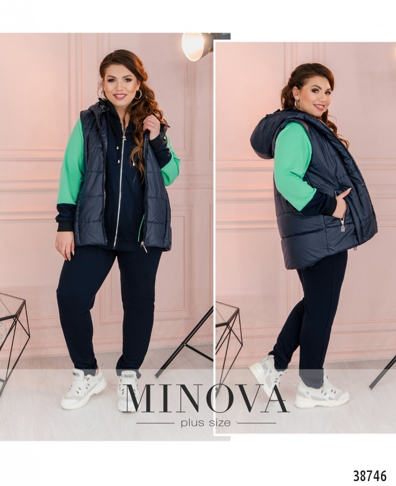 Стильный городской костюм-тройка батал. В комплекте - жилетка, брюки и кофта. Кофта застёгивается спереди на молнию, по бокам - врезные карманы, в наличии капюшон, через него пропущен шнурок. Рукава с небольшими манжетами. Брюки с высокой талией, по бокам - карманы, в пояс вшита резинка. Безрукавка простёгана, с капюшоном и шнурком, по бокам - карманы под молнией, застёгивается на молнию по центру.