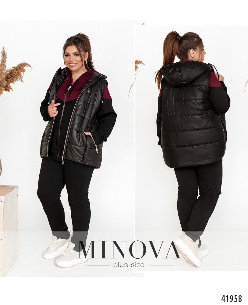 Привлекательный костюм-тройка батал с жилеткой. Жилетка простёгана, с карманами и декоративным швом, с подкладкой, застёгивается на молнию. Через капюшон пропущен шнурок. Свитшот с молнией по центру, с карманами по бокам, на рукавах мягкие манжеты, в наличии капюшон со шнурком. Брюки с высокой талией, в пояс вшита резинка, по бокам врезные карманы.