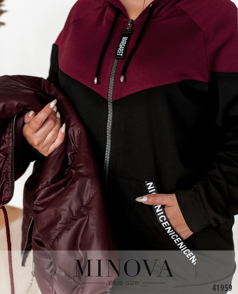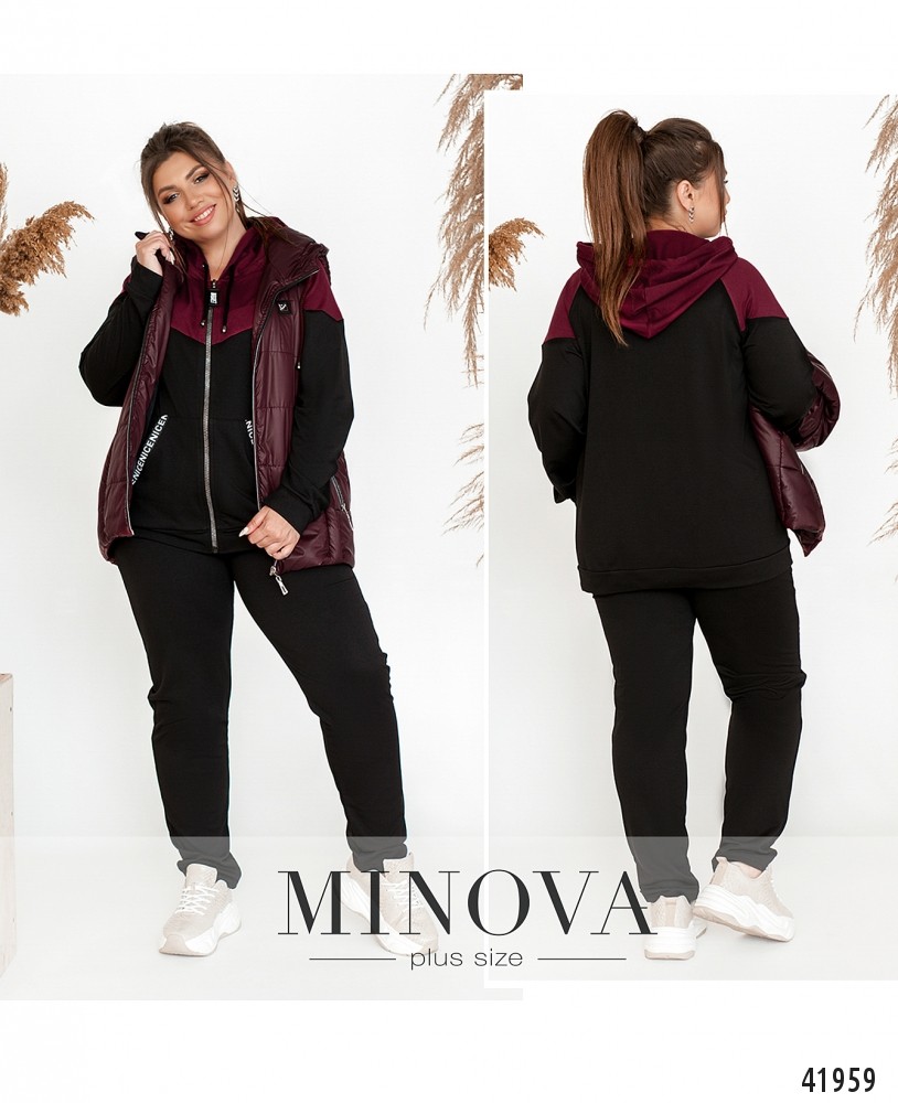 Привлекательный костюм-тройка батал с жилеткой. Жилетка простёгана, с карманами и декоративным швом, с подкладкой, застёгивается на молнию. Через капюшон пропущен шнурок. Свитшот с молнией по центру, с карманами по бокам, на рукавах мягкие манжеты, в наличии капюшон со шнурком. Брюки с высокой талией, в пояс вшита резинка, по бокам врезные карманы.