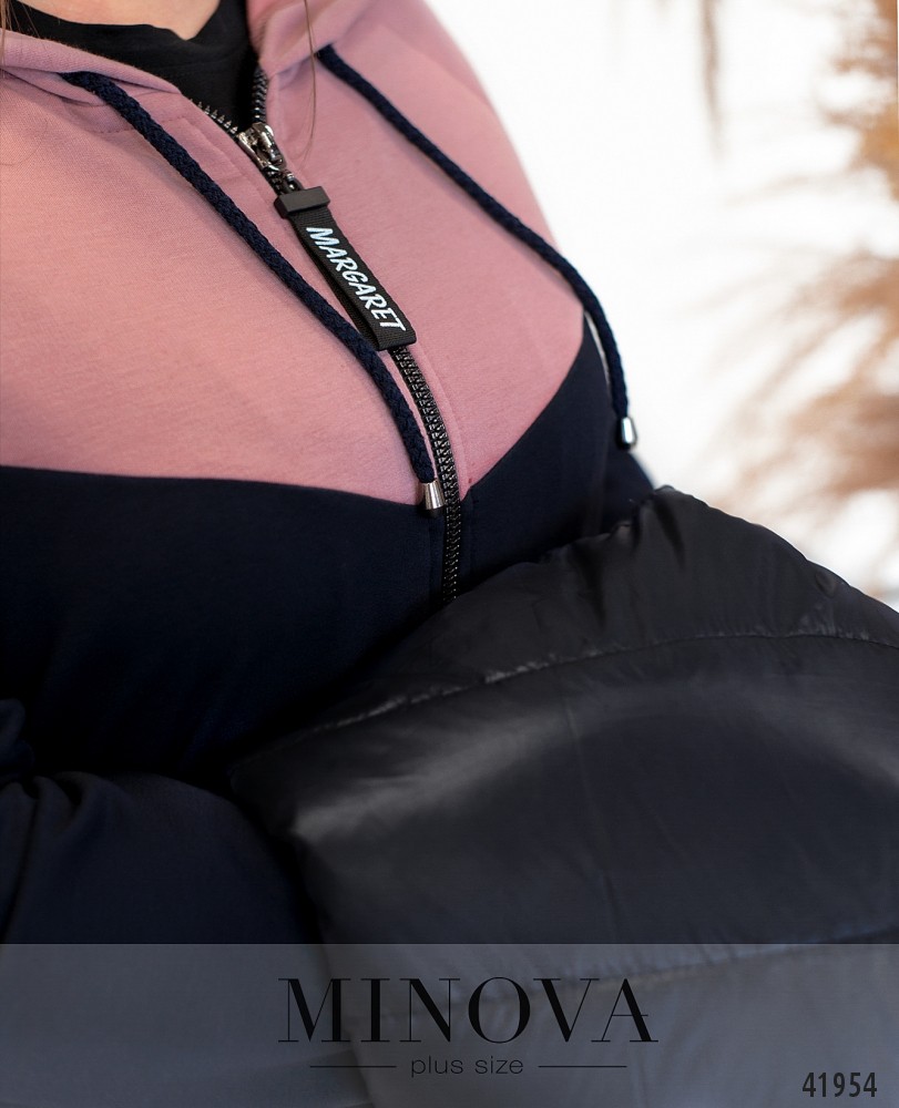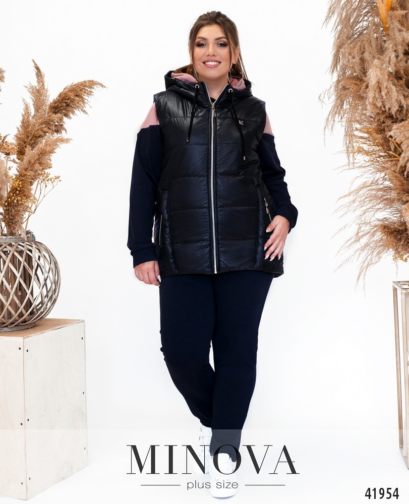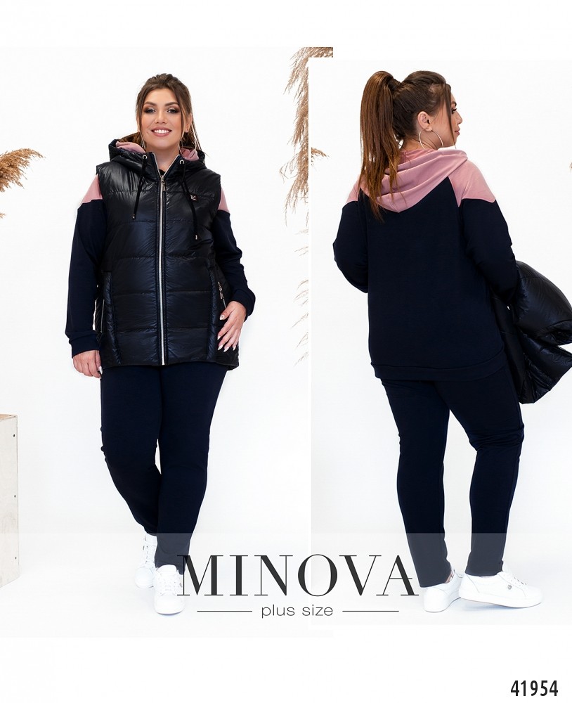Привлекательный костюм-тройка батал с жилеткой. Жилетка простёгана, с карманами и декоративным швом, с подкладкой, застёгивается на молнию. Через капюшон пропущен шнурок. Свитшот с молнией по центру, с карманами по бокам, на рукавах мягкие манжеты, в наличии капюшон со шнурком. Брюки с высокой талией, в пояс вшита резинка, по бокам врезные карманы.