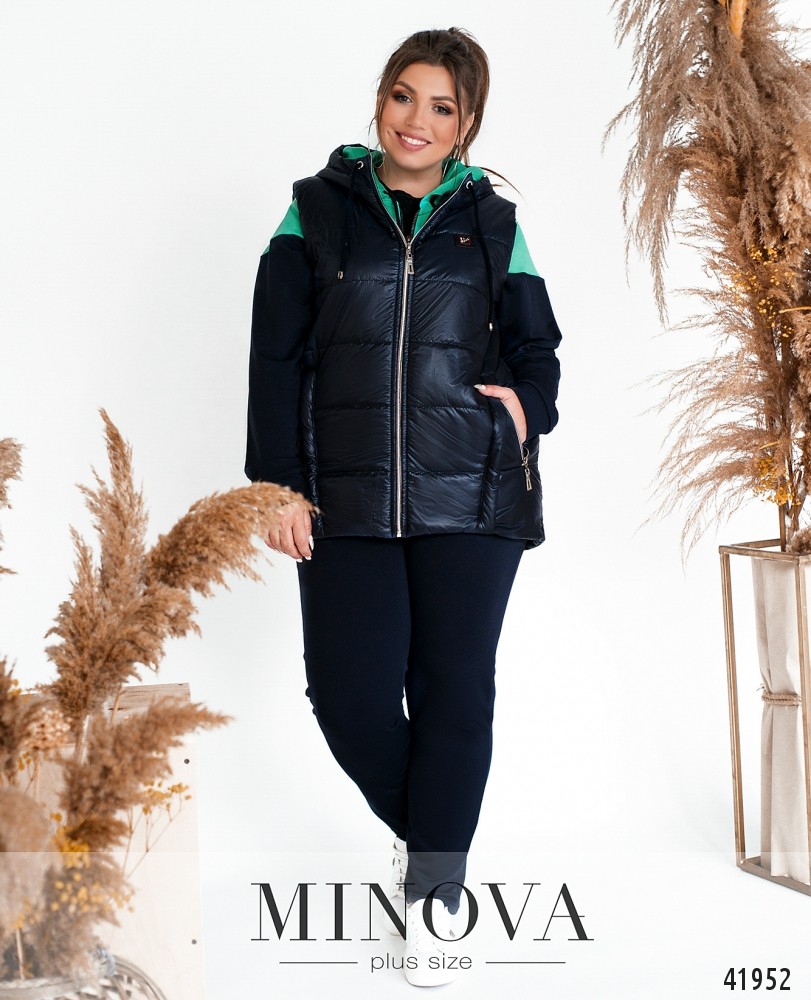 Привлекательный костюм-тройка батал с жилеткой. Жилетка простёгана, с карманами и декоративным швом, с подкладкой, застёгивается на молнию. Через капюшон пропущен шнурок. Свитшот с молнией по центру, с карманами по бокам, на рукавах мягкие манжеты, в наличии капюшон со шнурком. Брюки с высокой талией, в пояс вшита резинка, по бокам врезные карманы.