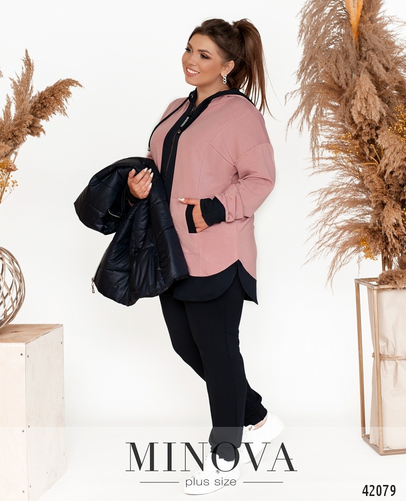 Мягкий и тёплый костюм-тройка батал. Жилетка с врезными карманами по бокам, застёгиваются на молнию, молния расположена также по центру, в наличии капюшон. Жилетка простёганная. Брюки с высокой талией, по бокам - врезные карманы, в пояс вшита резинка. Кофточка с молнией по центру, с врезными карманами, рукава с мягкими манжетами, в наличии капюшон.