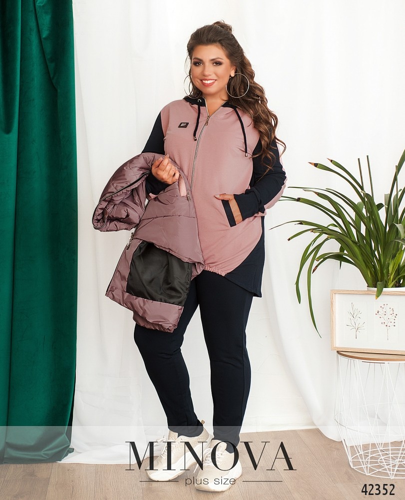 Костюм-тройка большого размера. Жилетка простёгана, по бокам - врезные карманы под молнией, застёгивается на молнию, молния с двумя бегунками, изнутри подкладка. Свитшот с капюшоном и карманами, на груди декоративная нашивка, на рукавах лампасы. Застёгивается на молнию с двумя бегунками. Брюки однотонные, в пояс вшита резинка, посадка высокая, по бокам врезные карманы.