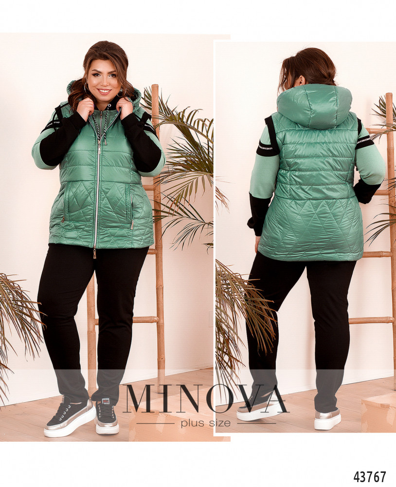 Удобный и стильный костюм-тройка батал, жилет из простёганной разнонаправленными стежками ткани. Жилет с подкладкой, с капюшоном, который не отстёгивается, через него пропущен шнурок. По бокам - врезные карманы под молнией. По центру - молния. Проймы с резинкой. Толстовка с молнией по центру, через капюшон пропущен шнурок, рукава и подол с манжетами. Декорирована лентой с принтом. Брюки с высокой посадкой и врезными карманами по бокам, в пояс вшита резинка.