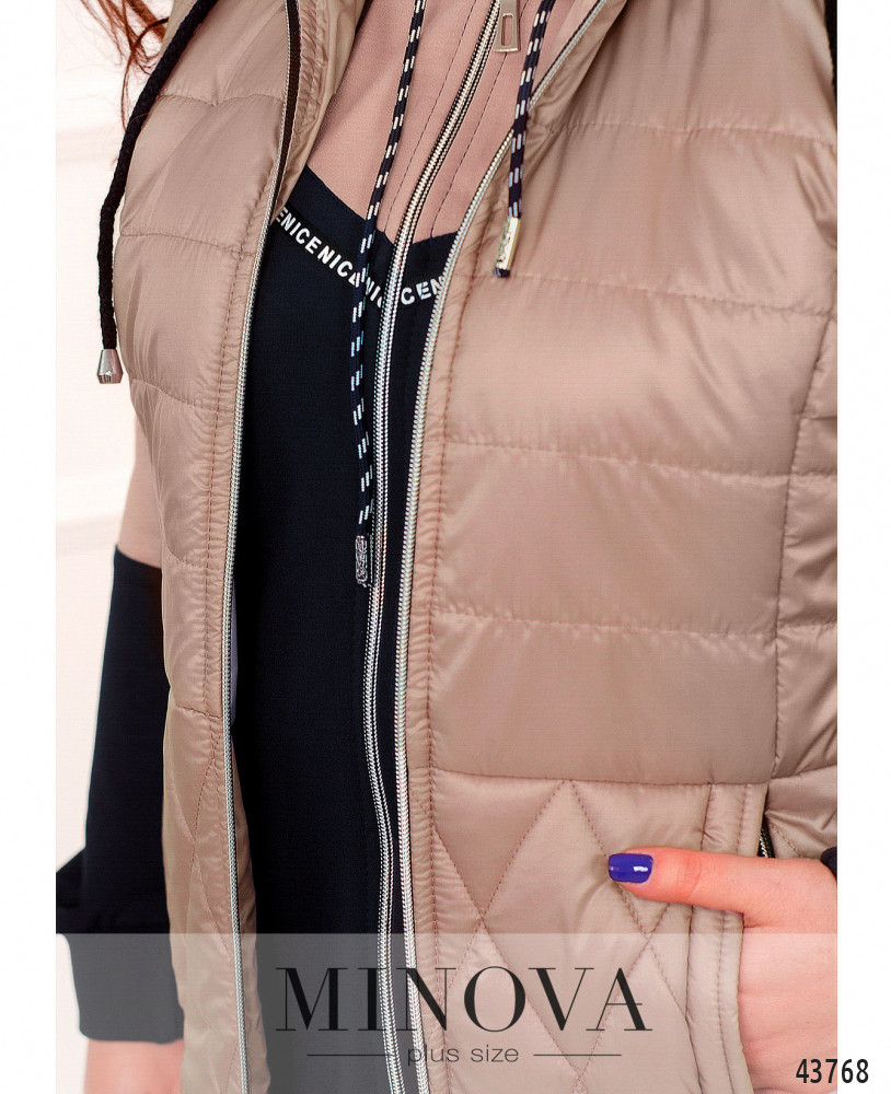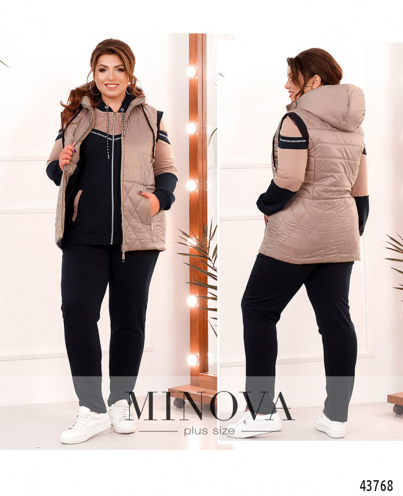 Удобный и стильный костюм-тройка батал, жилет из простёганной разнонаправленными стежками ткани. Жилет с подкладкой, с капюшоном, который не отстёгивается, через него пропущен шнурок. По бокам - врезные карманы под молнией. По центру - молния. Проймы с резинкой. Толстовка с молнией по центру, через капюшон пропущен шнурок, рукава и подол с манжетами. Декорирована лентой с принтом. Брюки с высокой посадкой и врезными карманами по бокам, в пояс вшита резинка.