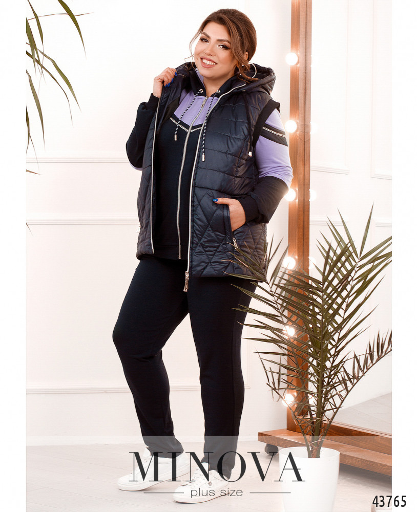 Удобный и стильный костюм-тройка батал, жилет из простёганной разнонаправленными стежками ткани. Жилет с подкладкой, с капюшоном, который не отстёгивается, через него пропущен шнурок. По бокам - врезные карманы под молнией. По центру - молния. Проймы с резинкой. Толстовка с молнией по центру, через капюшон пропущен шнурок, рукава и подол с манжетами. Декорирована лентой с принтом. Брюки с высокой посадкой и врезными карманами по бокам, в пояс вшита резинка.