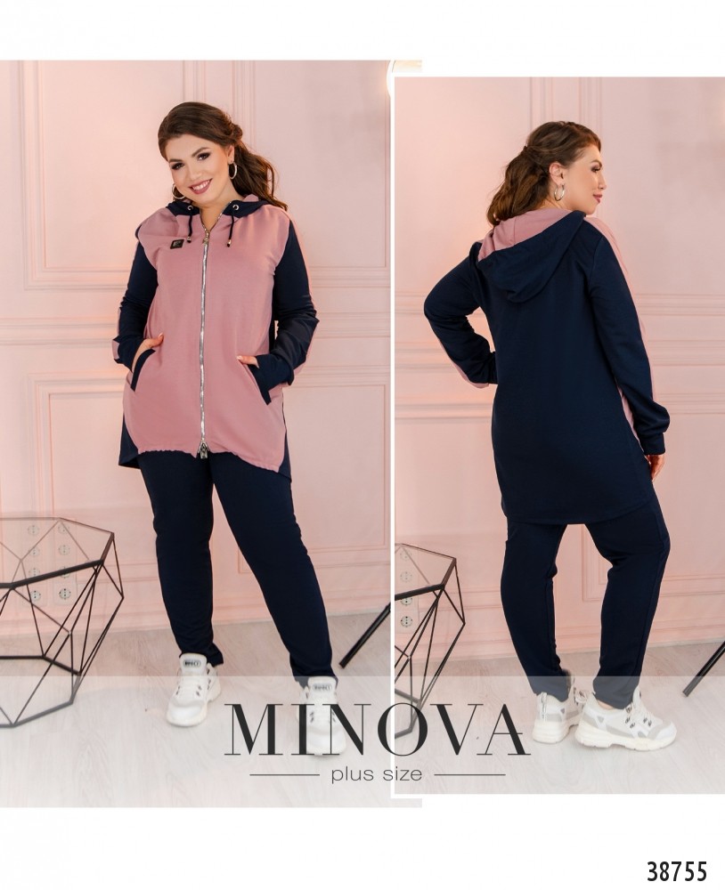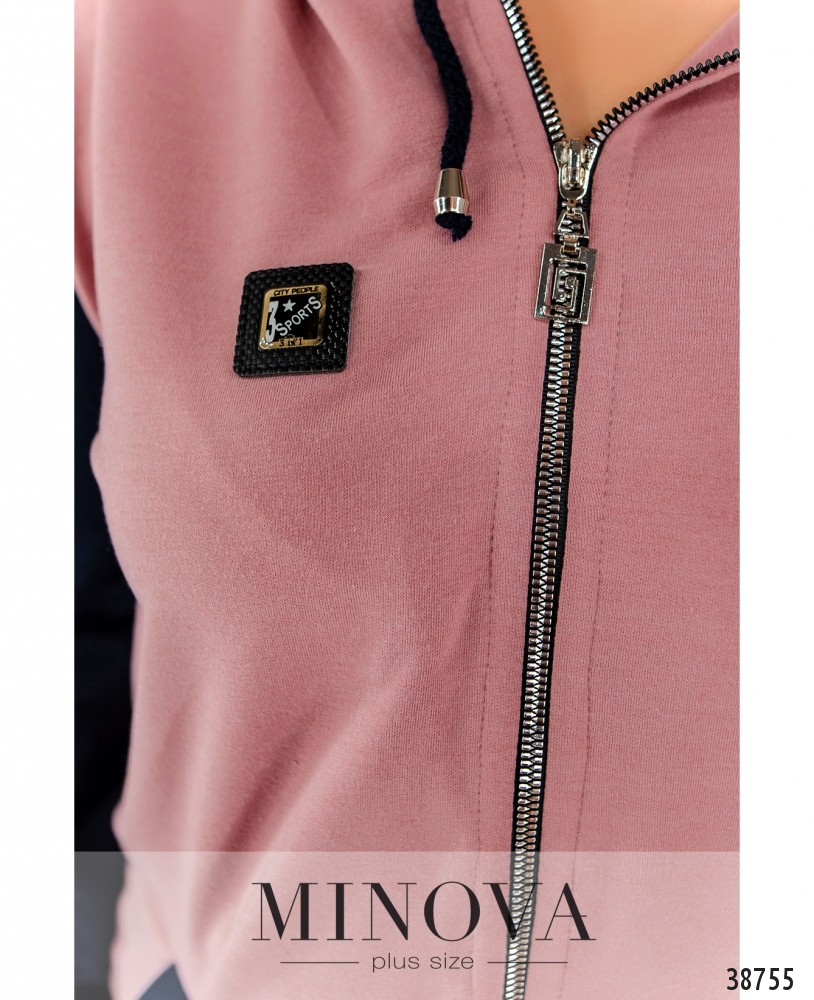 Удобный и яркий повседневный костюм-двойка батал в спортивном стиле. Кофта с молнией по центру, застёгивается на два бегунка, по бокам - карманы, рукава с мягкими манжетами, в наличии капюшон, через него пропущен шнурок. Брюки с высокой посадкой, по бокам - карманы, в пояс вшита резинка, без манжет.