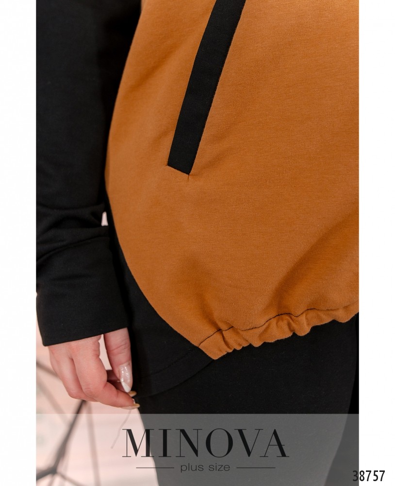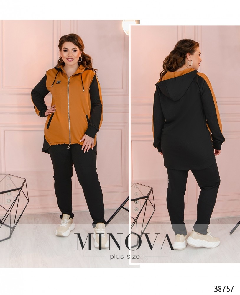 Удобный и яркий повседневный костюм-двойка батал в спортивном стиле. Кофта с молнией по центру, застёгивается на два бегунка, по бокам - карманы, рукава с мягкими манжетами, в наличии капюшон, через него пропущен шнурок. Брюки с высокой посадкой, по бокам - карманы, в пояс вшита резинка, без манжет.