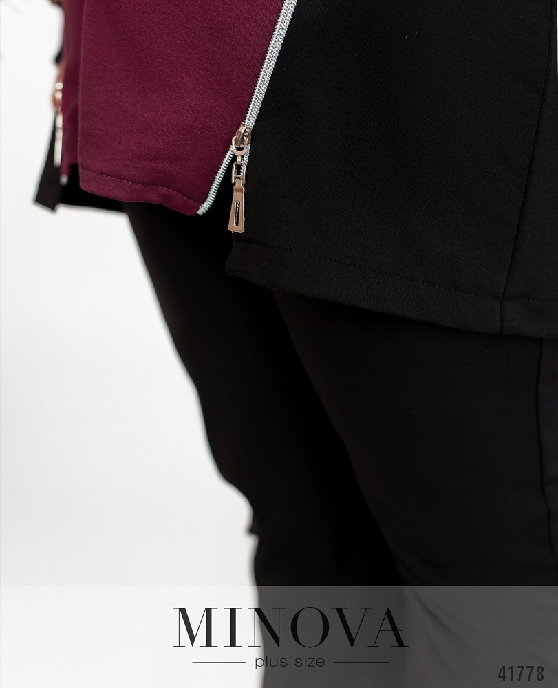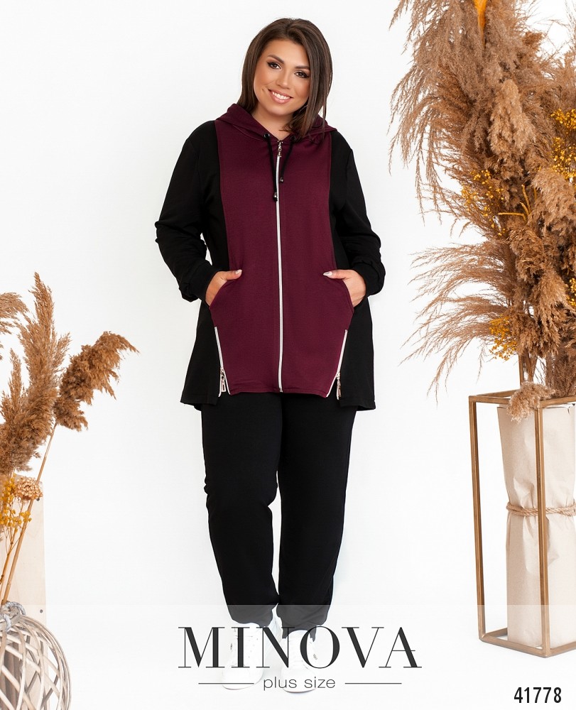 Оригинальный костюм батал с брюками и свитшотом. Свитшот с рабочей молнией по центру и двумя декоративными - по диагонали на подоле. В наличии капюшон. Рукава с мягкими манжетами. По бокам - врезные карманы. Брюки с высокой талией, в пояс вшита резинка, в наличии карманы. Брюки с манжетой внизу. Манжета рукава в кофте-трикотаж рибана.