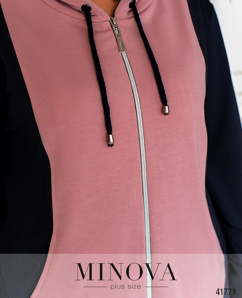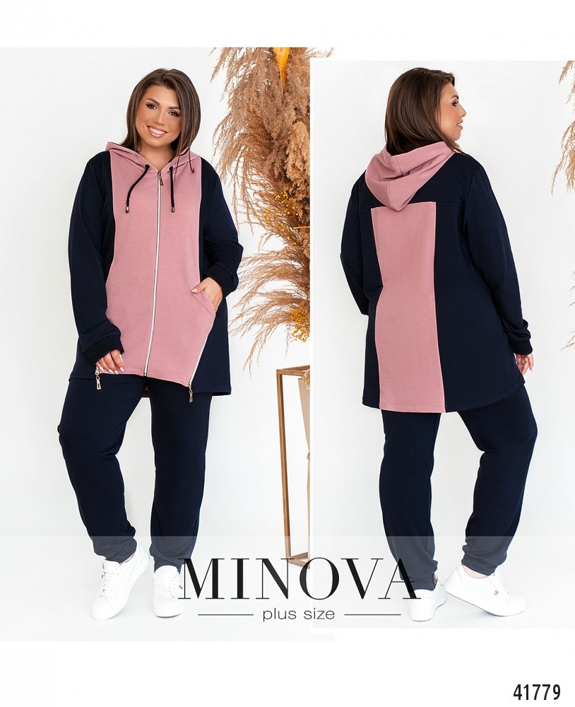 Оригинальный костюм батал с брюками и свитшотом. Свитшот с рабочей молнией по центру и двумя декоративными - по диагонали на подоле. В наличии капюшон. Рукава с мягкими манжетами. По бокам - врезные карманы. Брюки с высокой талией, в пояс вшита резинка, в наличии карманы. Брюки с манжетой внизу. Манжета рукава в кофте-трикотаж рибана.