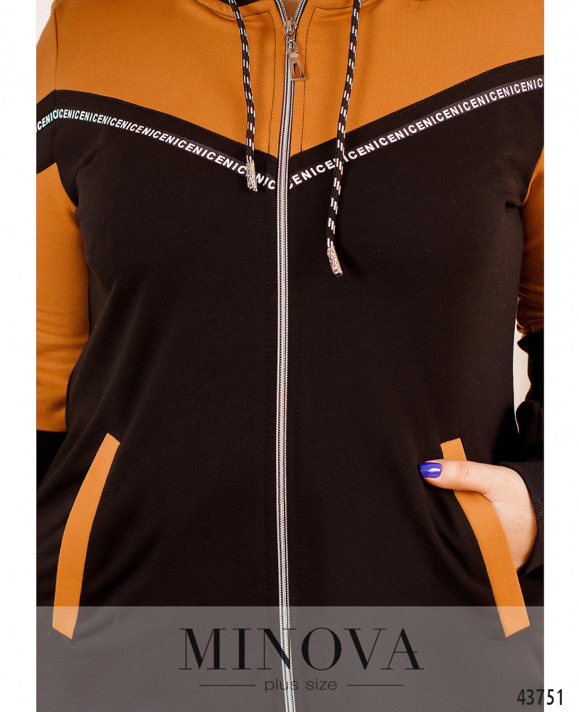 Оригинальный костюм батал, худи застёгивается на молнию спереди по центру, через капюшон пропущен шнурок. Худи декорировано яркой лентой с принтом спереди и на рукавах. По бокам - врезные карманы, рукава и подол с манжетом. Брюки с высокой талией, в пояс вшита резинка, по бокам - врезные карманы.