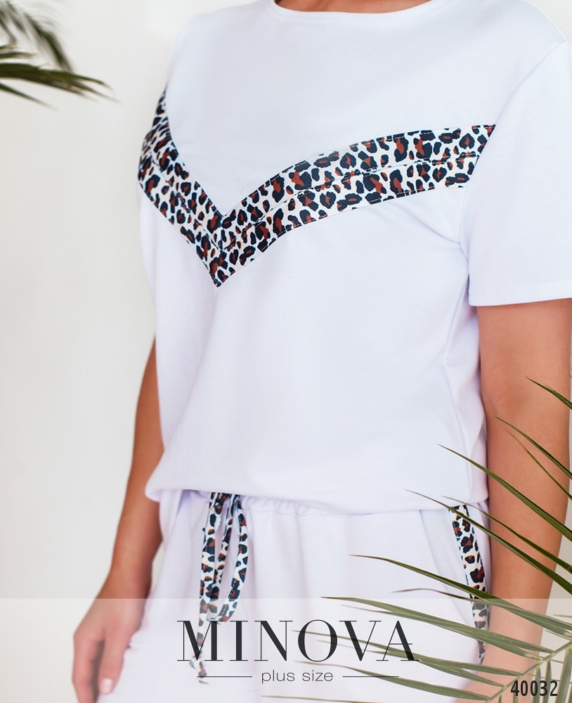 Стильный спортивный костюм большого размера с актуальным принтом на футболке и на брюках в виде лампас. Футболка без карманов и застёжек, брюки со вшитой в пояс резинкой, по бокам врезные карманы, посадка высокая.