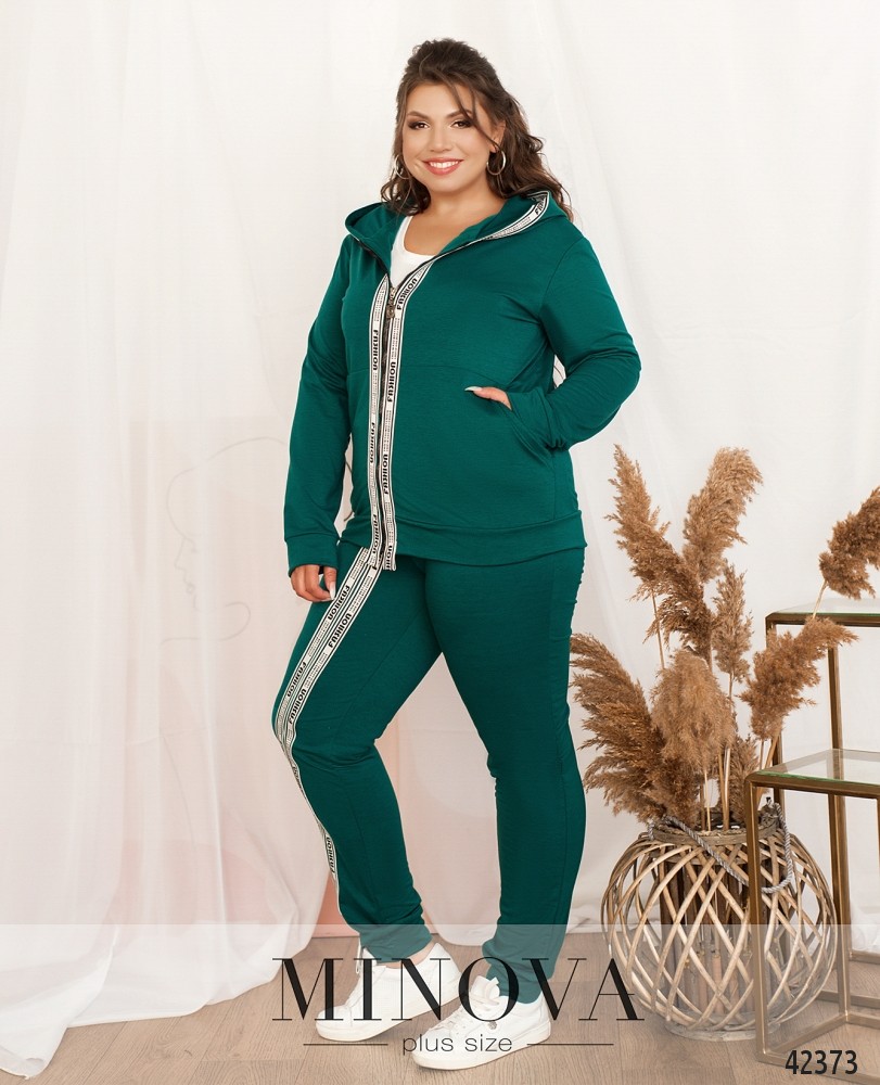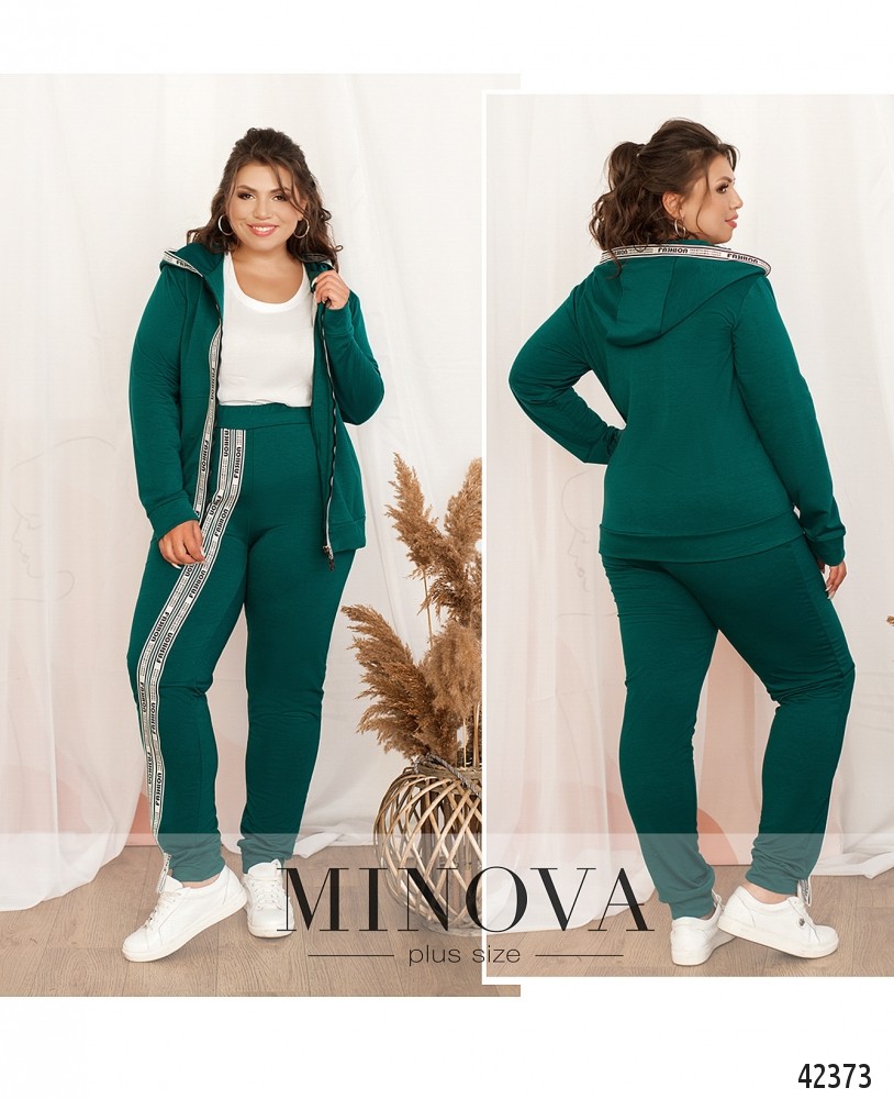 Элегантный спортивный костюм большого размера. Толстовка с накладными карманами по бокам и декоративной планкой-принтом, под ней - рабочая молния, толстовка с капюшоном. Рукава с мягкими манжетами. Брюки с лампасами в тон планке, по бокам - врезные карманы, посадка высокая, в пояс вшита резинка, снизу манжеты.