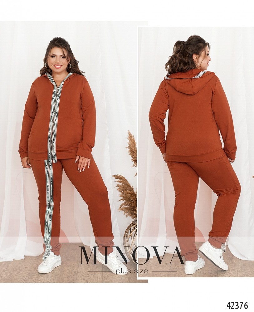 Элегантный спортивный костюм большого размера. Толстовка с накладными карманами по бокам и декоративной планкой-принтом, под ней - рабочая молния, толстовка с капюшоном. Рукава с мягкими манжетами. Брюки с лампасами в тон планке, по бокам - врезные карманы, посадка высокая, в пояс вшита резинка, снизу манжеты.