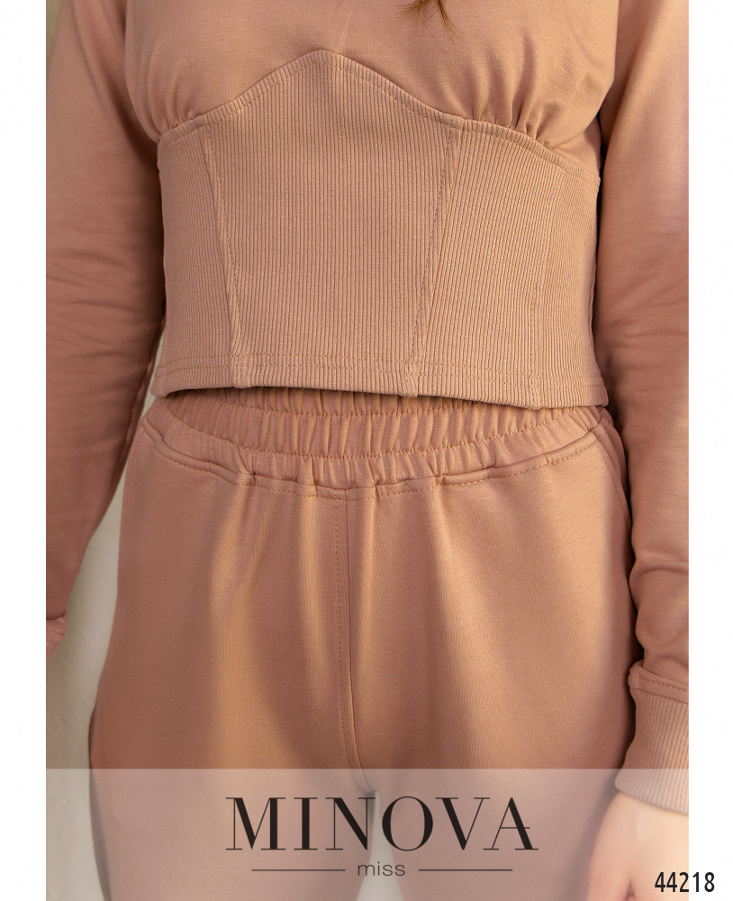 Оригинальный спортивный костюм, свитшот со вставкой резинки на подоле с вытачками спереди, что делает фасон похожим на корсет. Есть капюшон без шнурков. Рукава с мягкими манжетами. Застёжек и карманов нет. Брюки с высокой талией, в пояс и в манжеты вшита резинка, по бокам - карманы в шве.