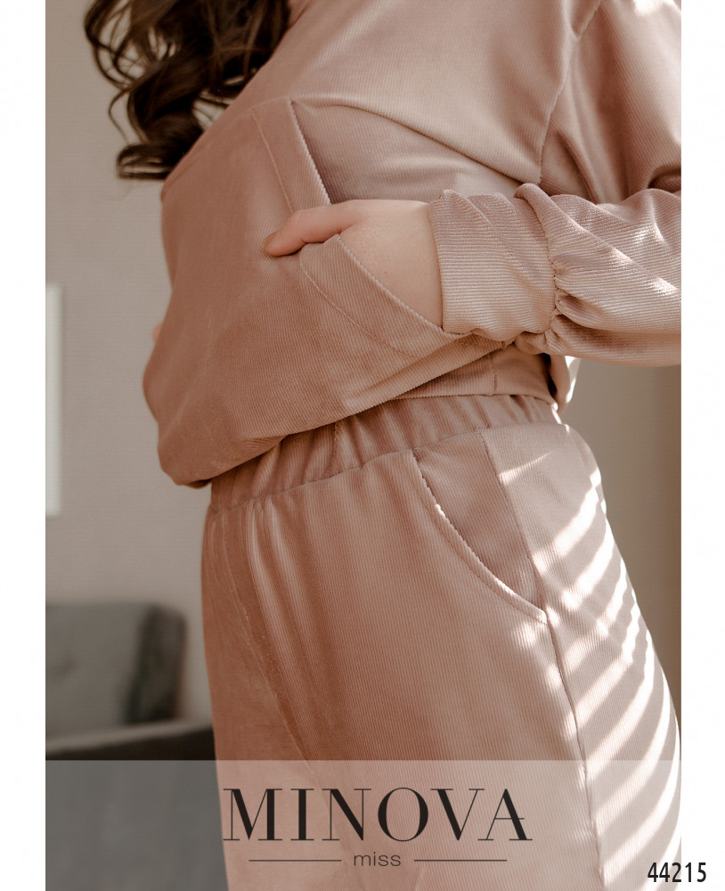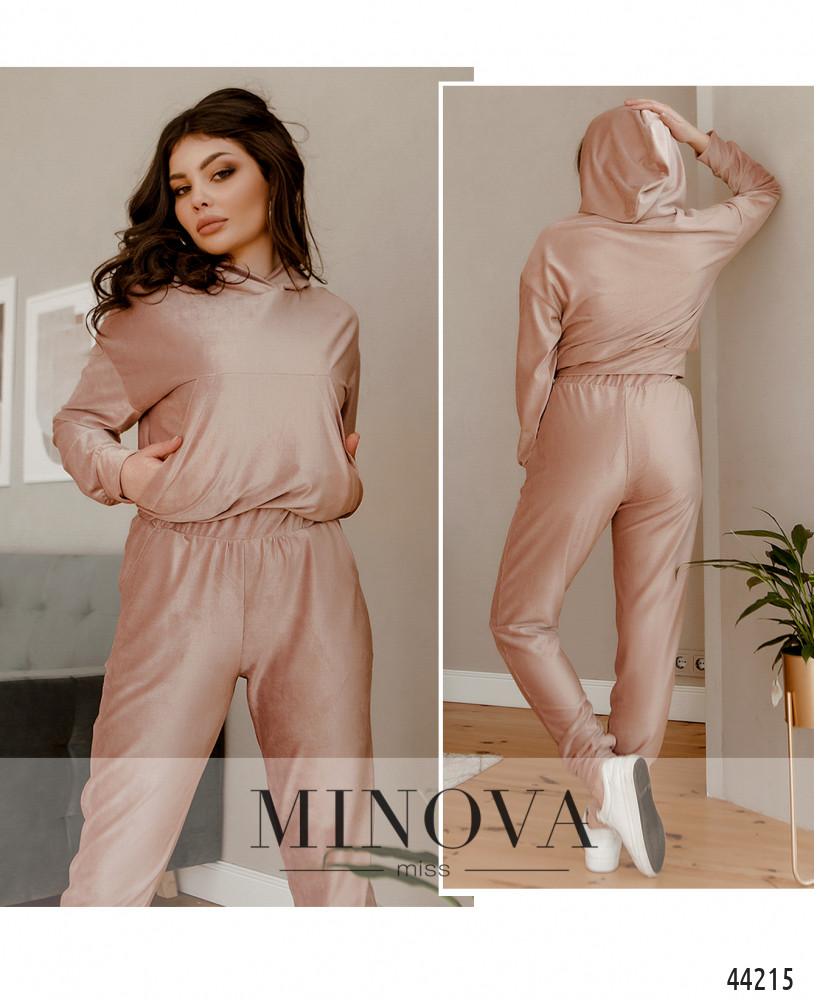 Мягкий и удобный спортивный костюм с толстовкой и брюками. Толстовка с капюшоном без шнурков и с объёмным карманом-кенгуру на талии, рукава и подол с мягкими манжетами. Без застёжек. Брюки с высокой талией, с манжетами, в пояс вшита резинка, по бокам карманы в шве.
