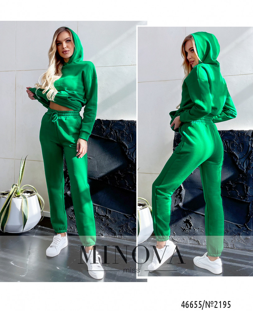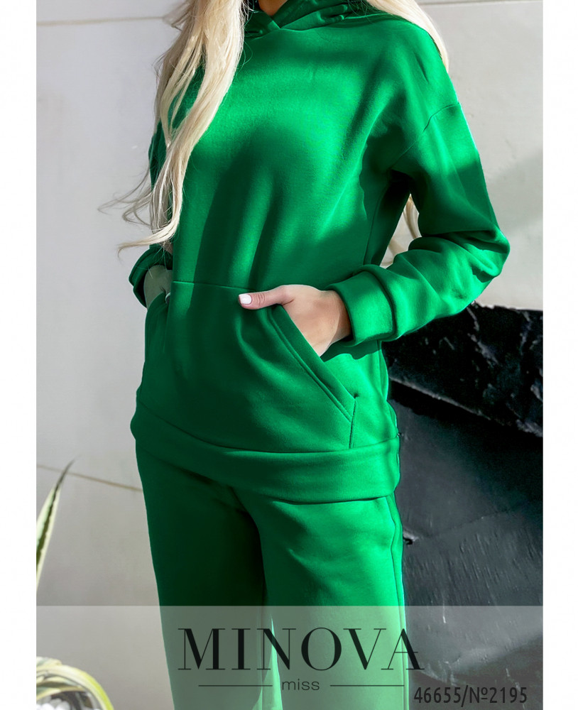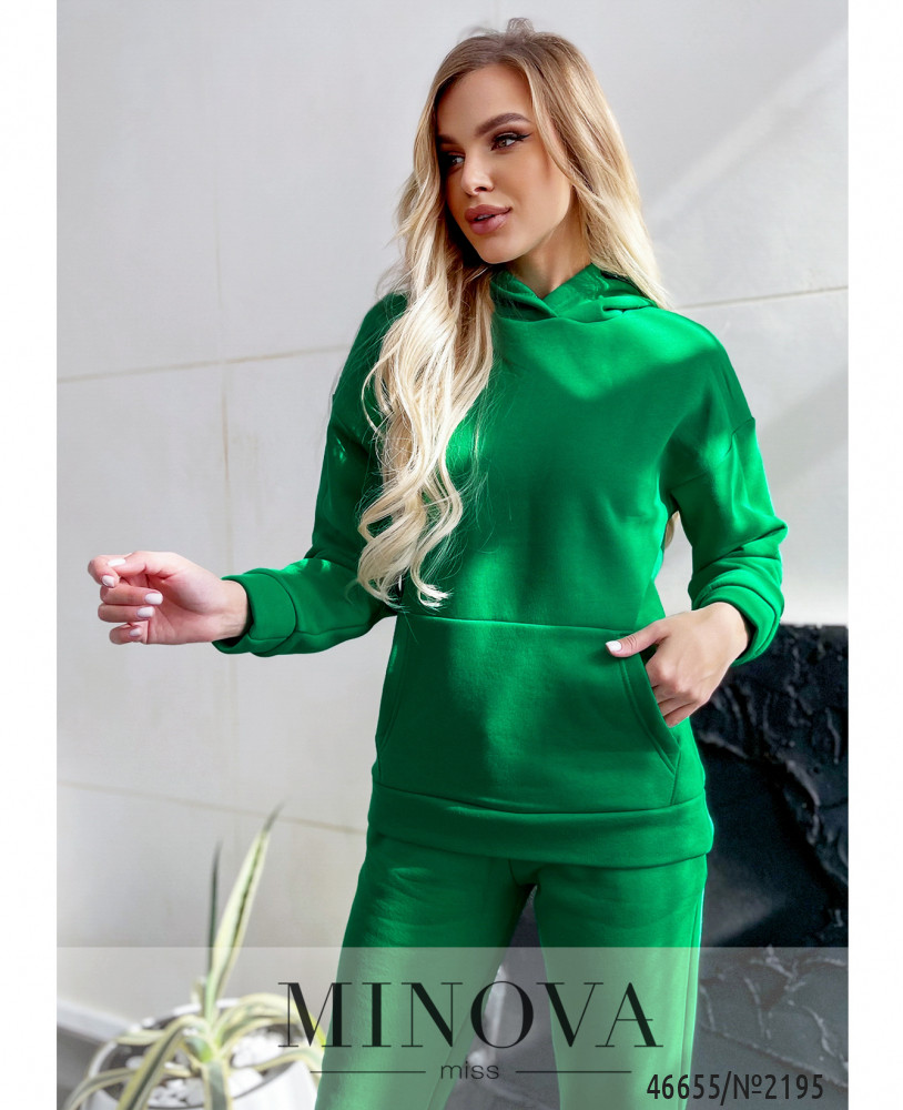 Монохромный яркий спортивный костюм привлекает внимание своей мягкостью и удобством. В комплект входят актуальные брюки-джоггеры с карманами и резинками, вставленными по линии талии и по низу штанин, а также лаконичное худи с капюшоном, большим карманом спереди и рукавами с приспущенной линией плеч.