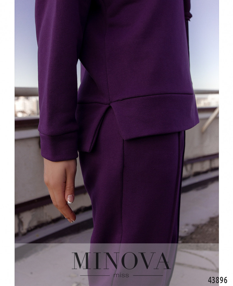 Элегантный и яркий костюм с толстовкой и брюками. Брюки с высокой талией, в пояс и в манжеты вшита резинка. По бокам - карманы в шве, спереди нашиты швы-стрелочки. Застёжек нет. Толстовка с капюшоном и шнурками, отверстия для шнурков без люверсов. Карманов нет, линия плеча приспущена. По бокам подола небольшие разрезы. Без застежек.