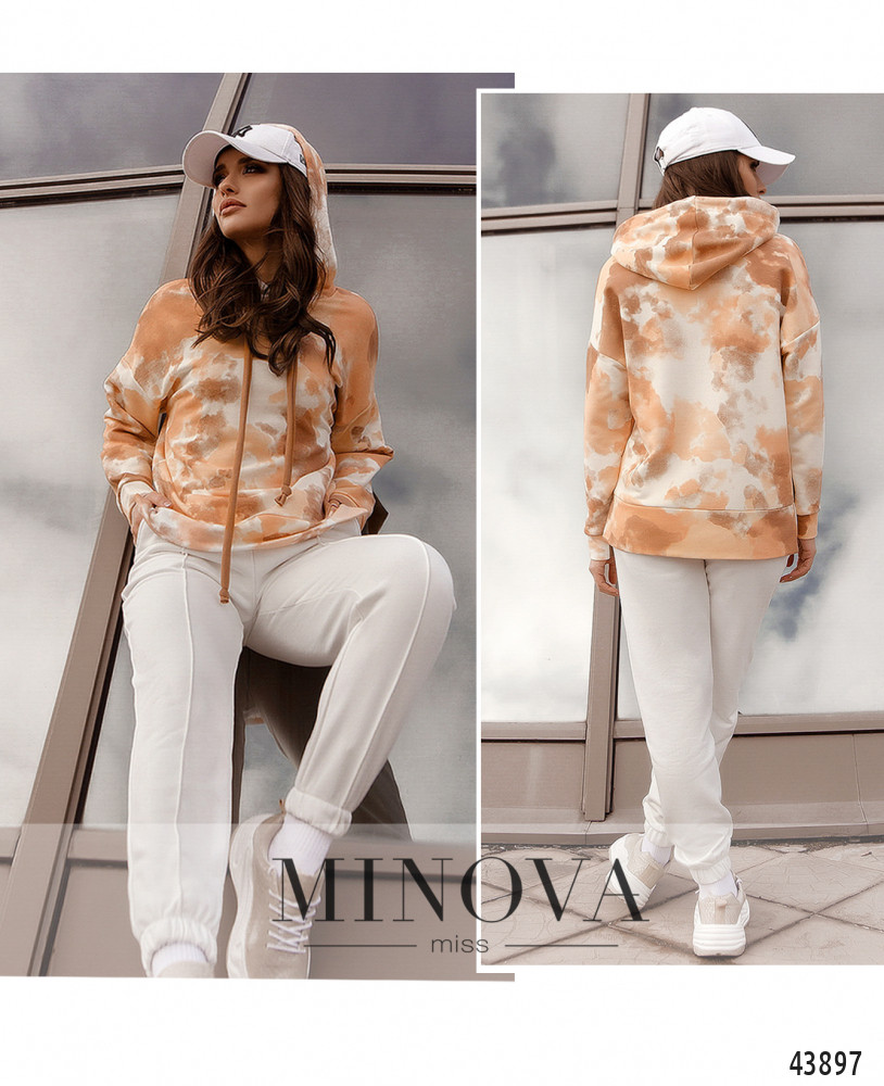 Элегантный и яркий костюм с толстовкой и брюками. Брюки с высокой талией, в пояс и в манжеты вшита резинка. По бокам - карманы в шве, спереди нашиты швы-стрелочки. Застёжек нет. Толстовка с капюшоном и шнурками, отверстия для шнурков без люверсов. Карманов нет, линия плеча приспущена. По бокам подола небольшие разрезы. Без застежек.