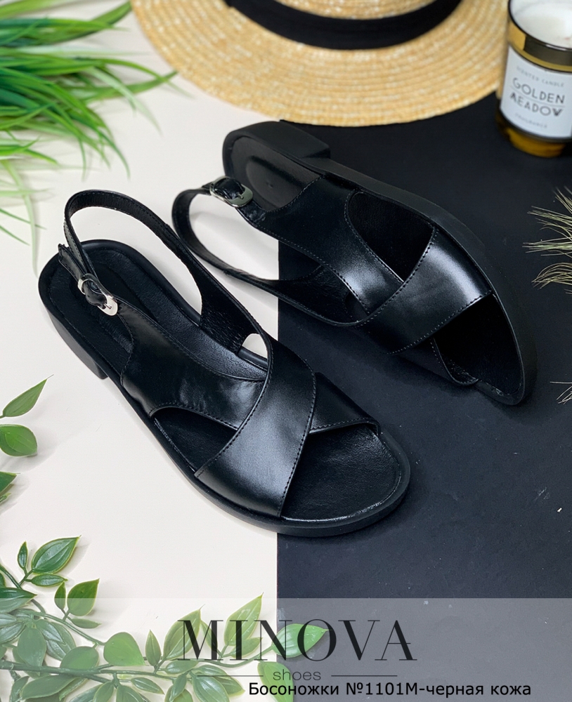 Кожаные сандалии на плоской подошве и небольшим тонким каблуком. Сандалии состоят из двух широких полос, переплетенных накрест и застегиваются на ремешок под щиколоткой. Внутри кожаная стелька.