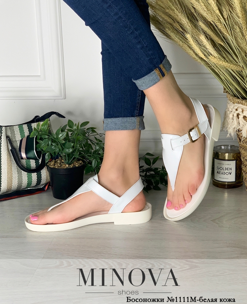 Кожаные сандалии через пальчик на тонкой плоской подошве и небольшом каблуке. Мыс через петлю соединяется с ремешком. Пяточка фиксируется перепонкой. Внутри кожаная стелька.