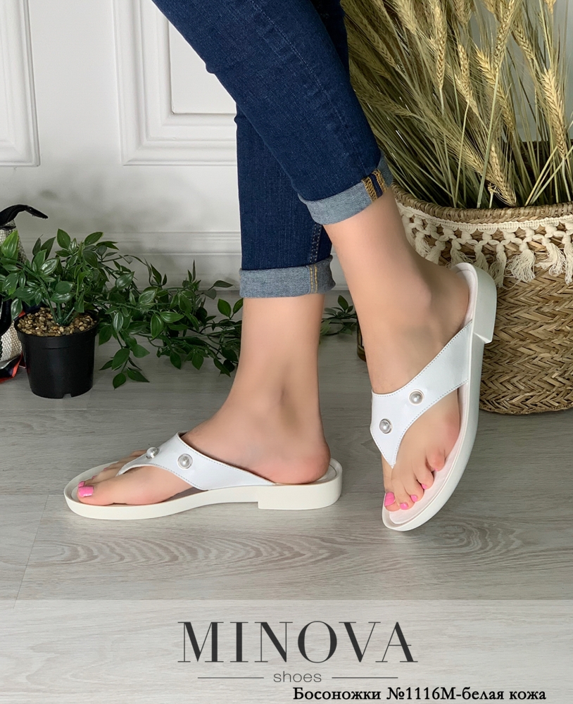 Кожаные мюли через пальчик на тонкой плоской подошве и небольшом каблуке. Мыс украшен белыми бусинами. Внутри кожаная стелька.