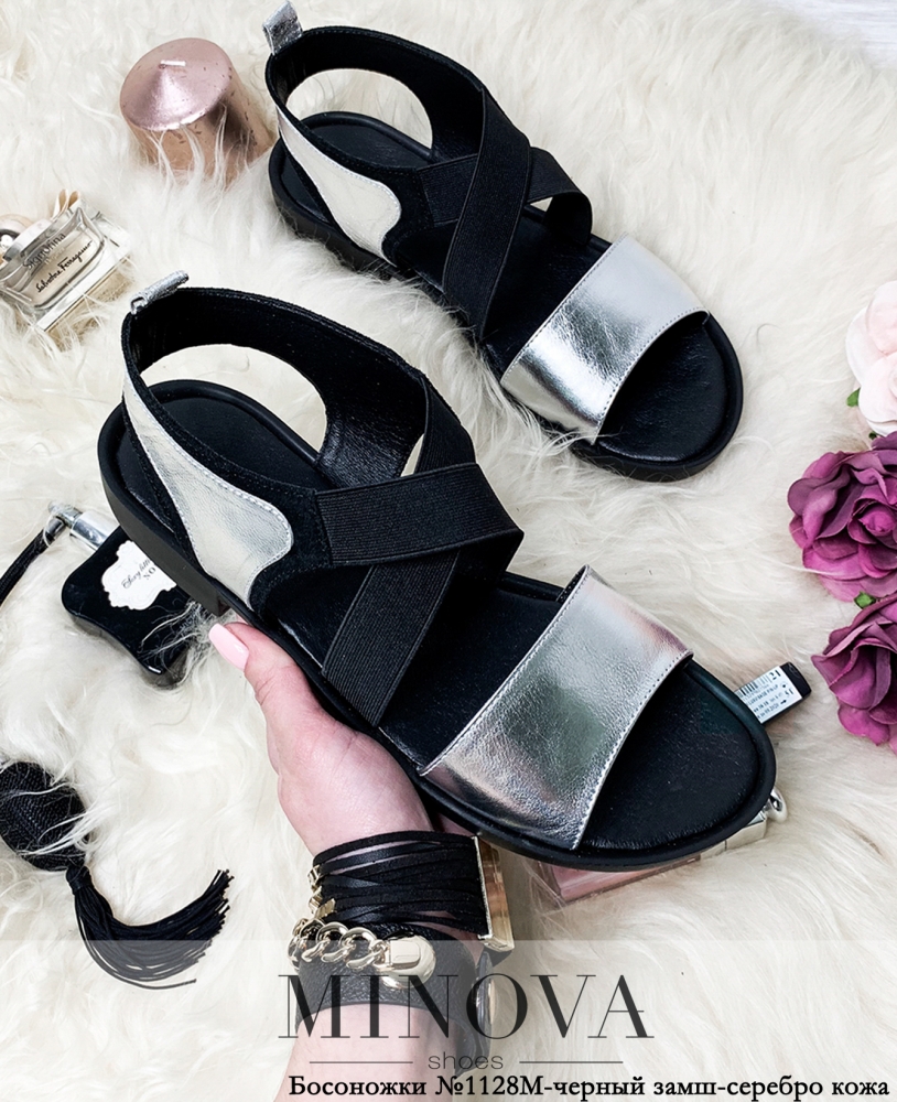 Кожаные сандалии на плоской бортовой подошве с небольшим каблуком. Нос и замшевый задник оформлены металлизированной кожей. Мыс выполнен из эластичных лент, расположенных накрест. Задник дополнен петлей.