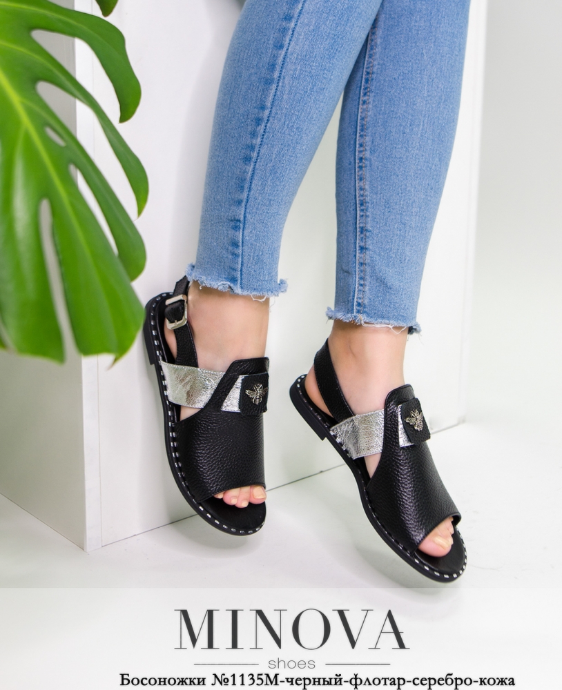 Стильные и яркие кожаные босоножки на низком ходу, с широким удобным пояском на щиколотке, на нём расположена застёжка с пряжкой. Украшены металлической нашивкой на подъёме. Носок открытый. Подошва окантована металлическим декором.