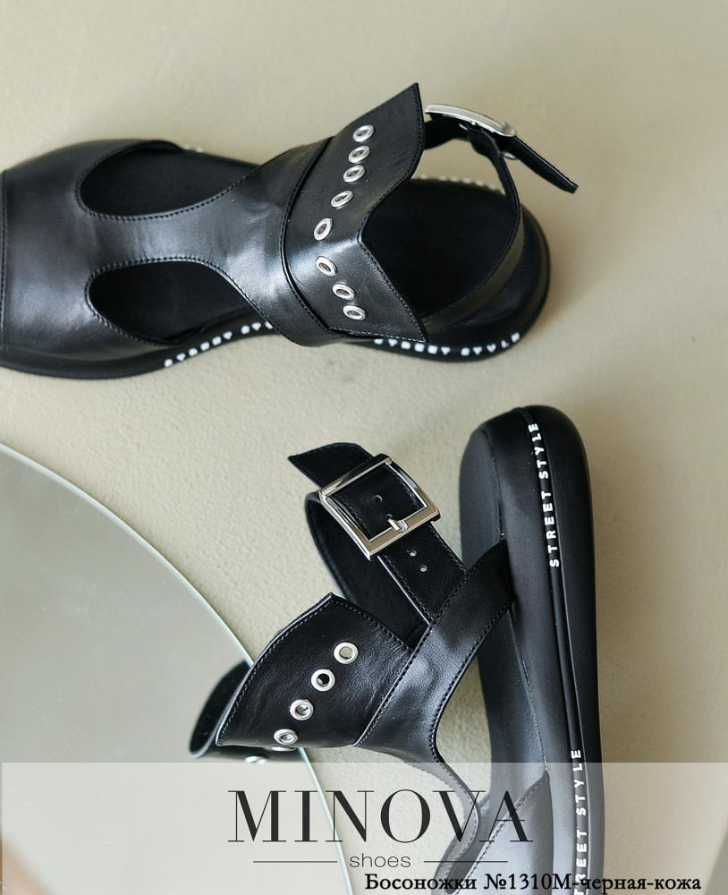 Оригинальные кожаные босоножки с застёжкой на пояске, охватывающем щиколотку. На подъёме - декоративная широкая вставка с отверстиями, укреплёнными люверсами. Подошва плотная, с декоративным принтом на кантике. Также на подъёме продольный поясок, соединяющий две части. Протектор с круглой неглубокой рельефностью.