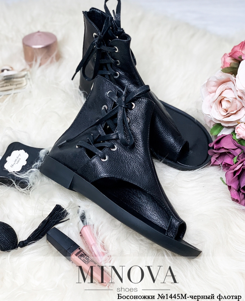 Высокие кожаные сандалии с закрытой пяткой открытым носом на плоской бортовой подошве и небольшом каблуке. Пятка застегивается на молнию. Боковые части оформлены шнуровкой. Носок фиксируется на большом пальце через петлю и открывает половину стопы. Внутри кожаная стелька.