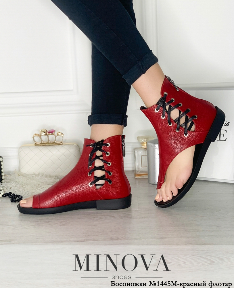Высокие кожаные сандалии с закрытой пяткой открытым носом на плоской бортовой подошве и небольшом каблуке. Пятка застегивается на молнию. Боковые части оформлены шнуровкой. Носок фиксируется на большом пальце через петлю и открывает половину стопы. Внутри кожаная стелька.