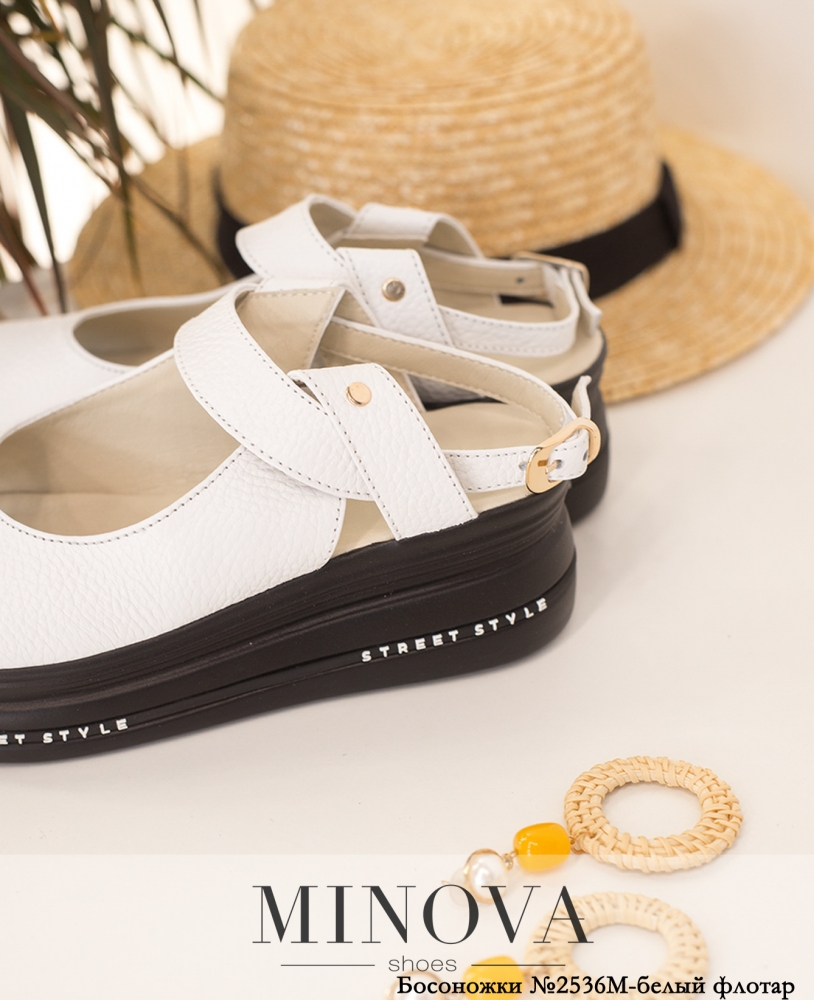 Стильные кожаные босоножки с высокой гибкой подошвой, украшенной декоративным принтом. Через верх перекинут поясок, носок и задник открытые. На ремешке на щиколотке - маленькая застёжка.