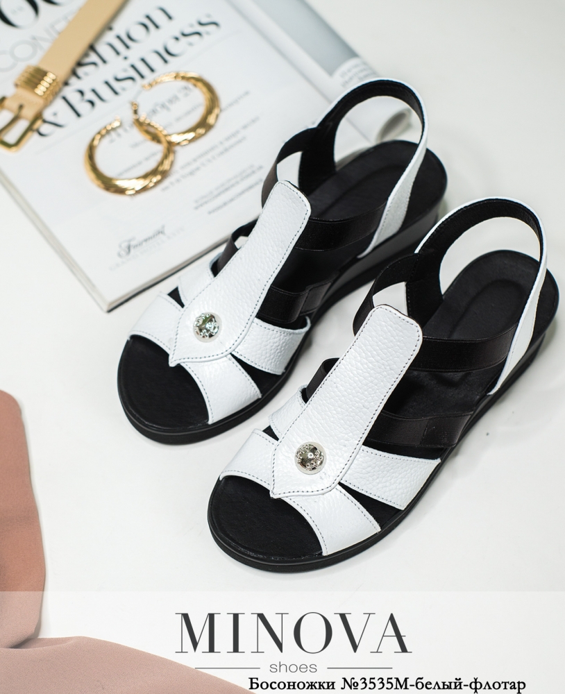 Нарядные и удобные босоножки на невысокой устойчивой танкетке, кожаные, без застёжек, с эластичными вставками на подъёме. Украшены металлическим декором на подъёме. Носок и пятка открытые.