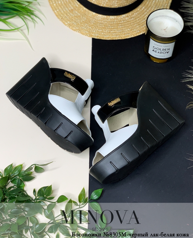 Кожаные мюли на высокой фактурной танкетке. Верхняя часть состоит из фигурно вырезанного кожаного полотна и лакового ремешка со значком. Внутри кожаная стелька.