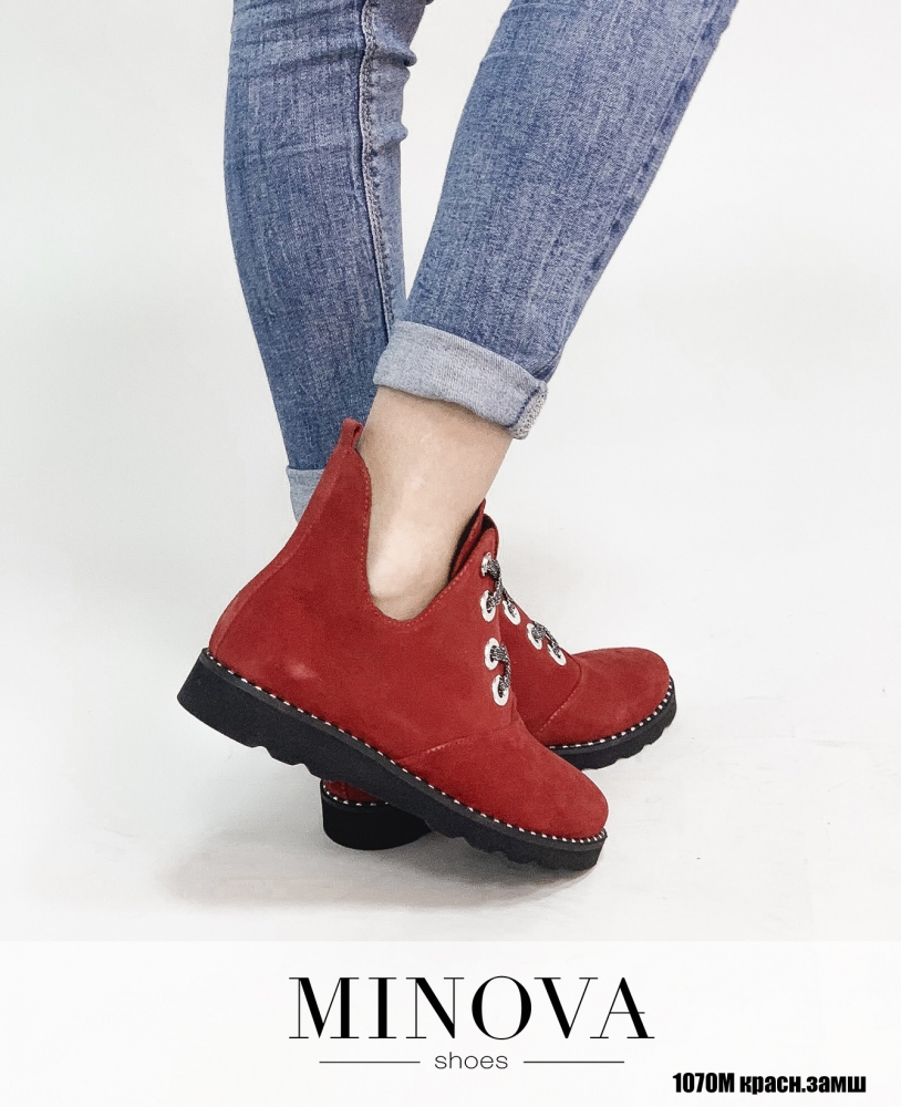 Замшевые ботинки на шнурках с фигурным голенищем. Ботинки на утолщенной рифленой подошве с декоративным блестящим рантом.