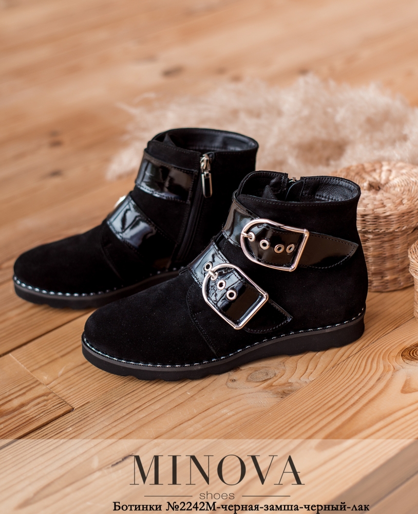 Оригинальные кожаные ботинки с двумя лакированными декоративными поясками, украшенными крупными пряжками и отверстиями с люверсами. Под поясками - язычок. Застёгиваются на змейку по внутренней стороне. Подошва рельефная, с поперечными углублениями. Ботинки с утеплением.