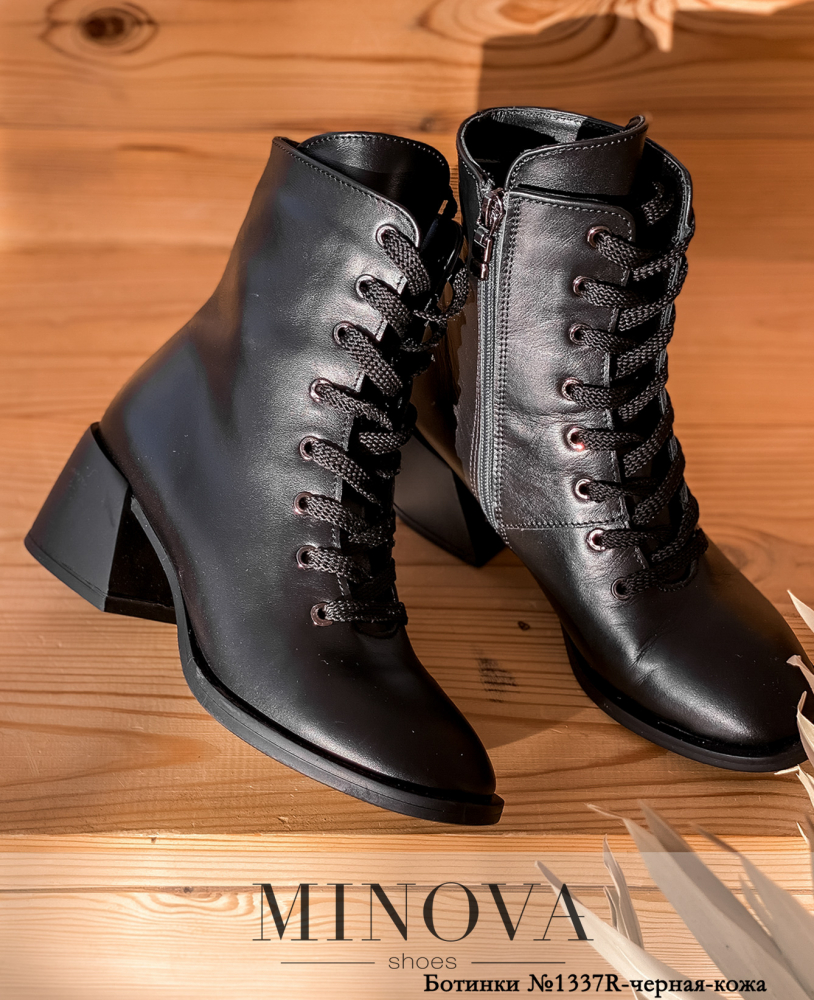 Стильные ботинки из натуральной кожи, каблук расширяется к низу. Застёжка - рабочая молния по внутренней стороне и шнуровка спереди по центру, под шнуровкой - язычок, отверстия укреплены люверсами. Ботинки с утеплением. Подошва с поперечным рифлением.
