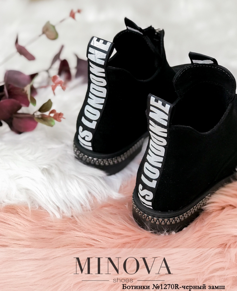 Кожаные ботинки с расположенной спереди молнией и удлинённым язычком, декорированным лентой с принтом. Носок отрезной, каблук невысокий, украшен металлическими заклёпками. Носок и задник выше средней части, выгнуты полукругом. Протектор мелкорифлёный.