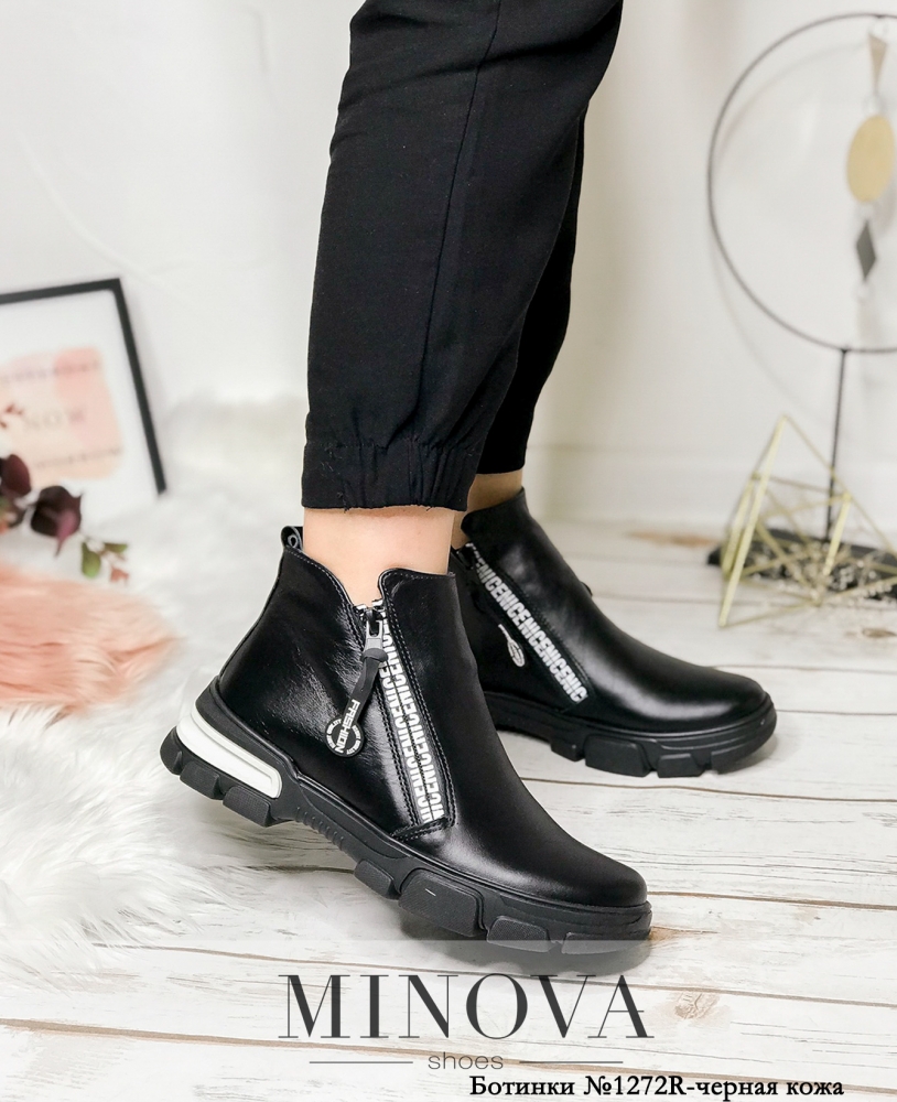 Кожаные «сникерсы» без шнуровки на плотной крупнорифлёной подошве. По бокам две рабочих молнии с декорированным бегунком и ярким принтом. Сзади петелька. На месте каблука – контрастная вставка.