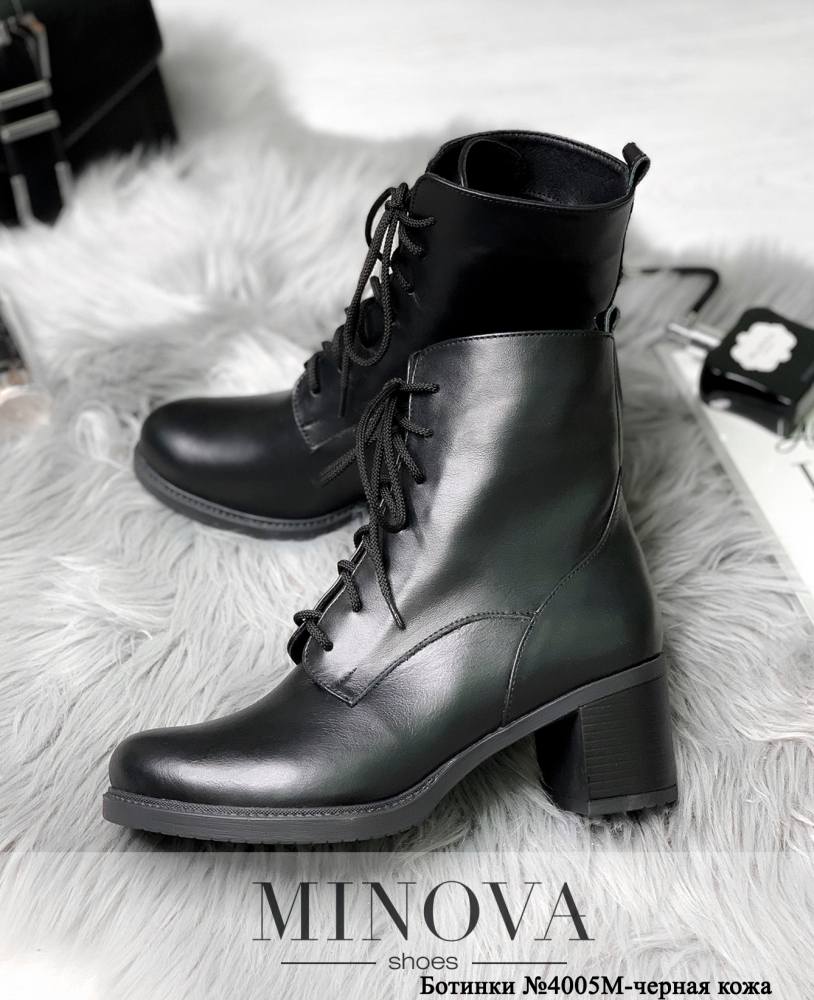 Строгие, минималистичные, но очень стильные ботинки из прекрасной натуральной кожи – гладкой, замшевой или лакированной, представлены в каталоге Minova в нескольких цветовых решениях. Так вы сможете выбрать модель, идеальную для вашего гардероба. Обувь однотонная, без инородных вставок. На подъёме располагается рабочая шнуровка с тонкими шнурками, без металлических колечек (люверсов) на отверстиях. Под шнуровкой – плотный язычок для большей герметичности. Внутри ботинки утеплены цигейкой. Каблук средней высоты, квадратный, удобный для долгих пеших прогулок, протектор мелкоребристый. Сзади сверху подшита петелька. Такие ботинки удачно будут сочетаться и с юбкой, и с брюками.