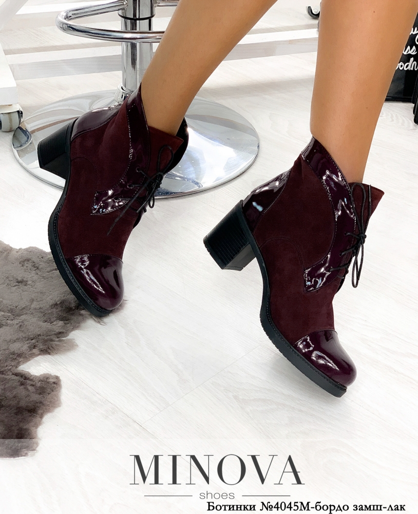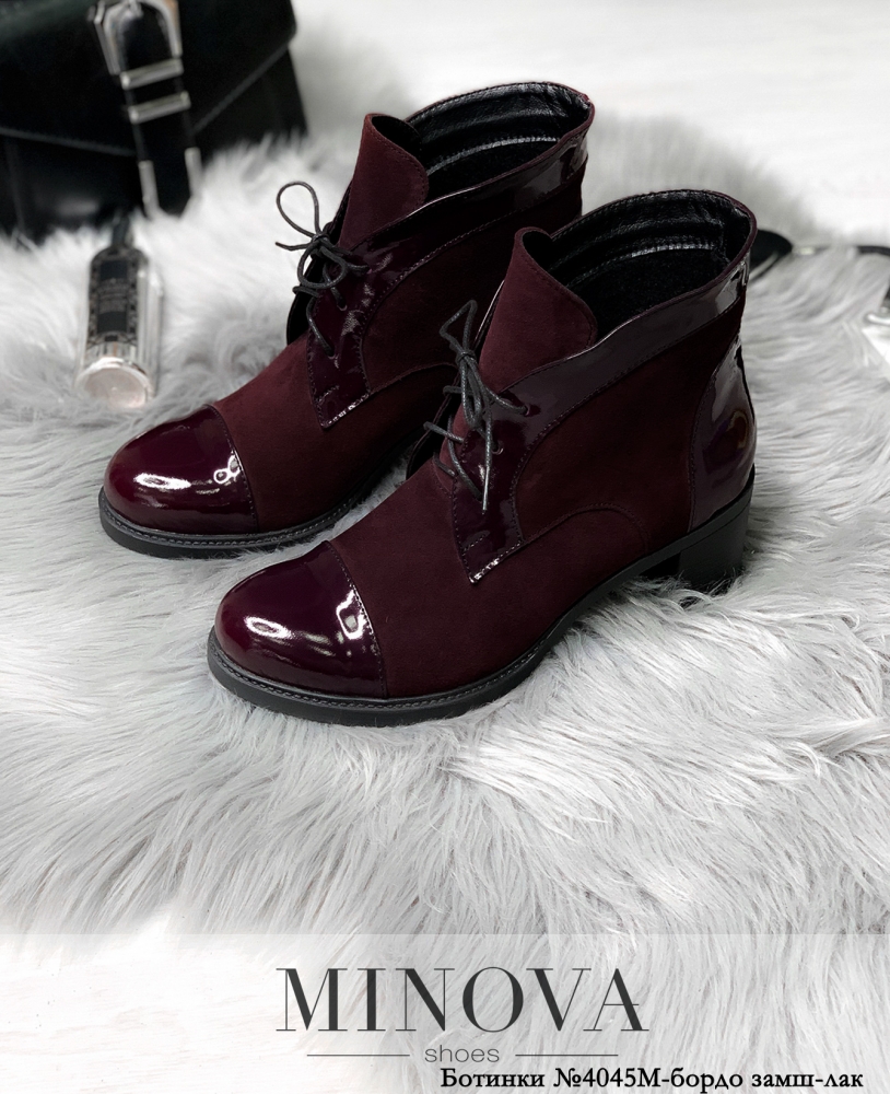 Сочетание нескольких видов натуральной кожи выглядит очень привлекательно и нарядно. Minova представляет в новом каталоге женской обуви ботинки на невысоком устойчивом каблуке, с мелкой ребристостью подошвы. Ботинки с немного скошенным вперёд верхом, отороченным лаковой кожей в большинстве вариантов. Носок и задник также лакированы. Основная часть – из замши или гладкой кожи. Внутри - утепление мягкой цигейкой. Спереди располагается шнуровка с тонкими шнурками без металлических люверсов, под ней - язычок. Такие ботинки прекрасно впишутся в деловой дресс-код, можно выбрать яркий, броский оттенок или благородный тёмный цвет.