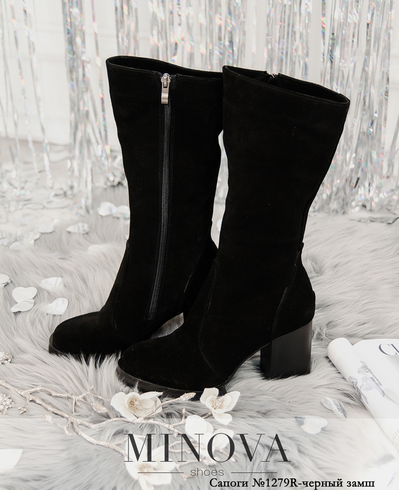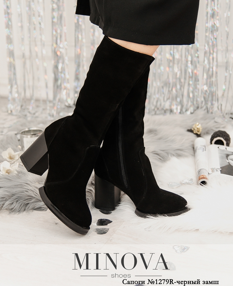 Элегантные сапоги из натуральной кожи с высоким голенищем и устойчивым высоким каблуком. Рабочая молния – по внутренней стороне голенища. Подошва с круглыми углублениями. Носок и задник – отрезные.