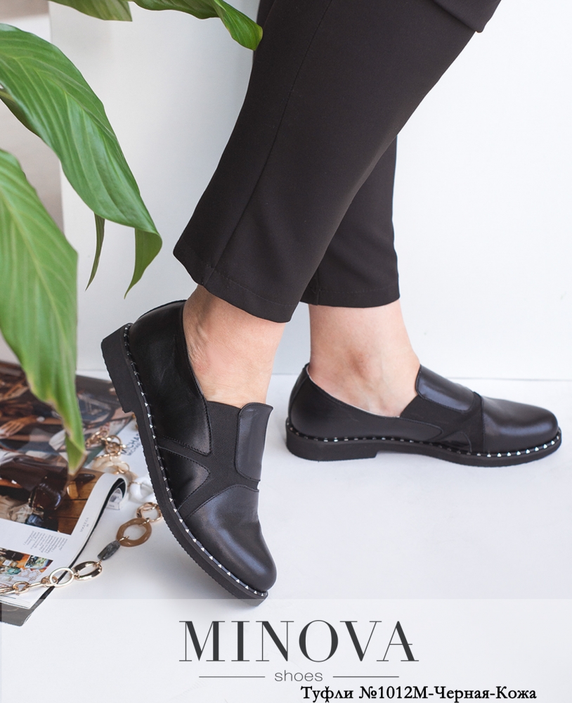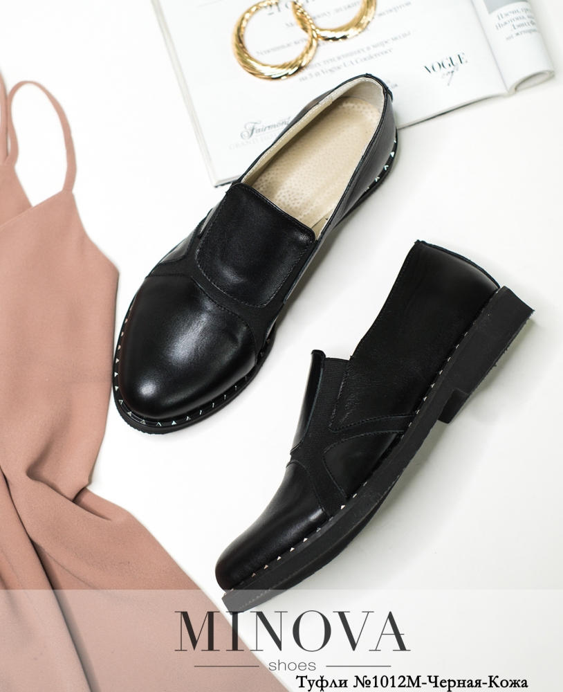 Стильные закрытые кожаные туфли без застёжек, подошва литая, с невысоким каблуком; по боковой поверхности - металлический декор.