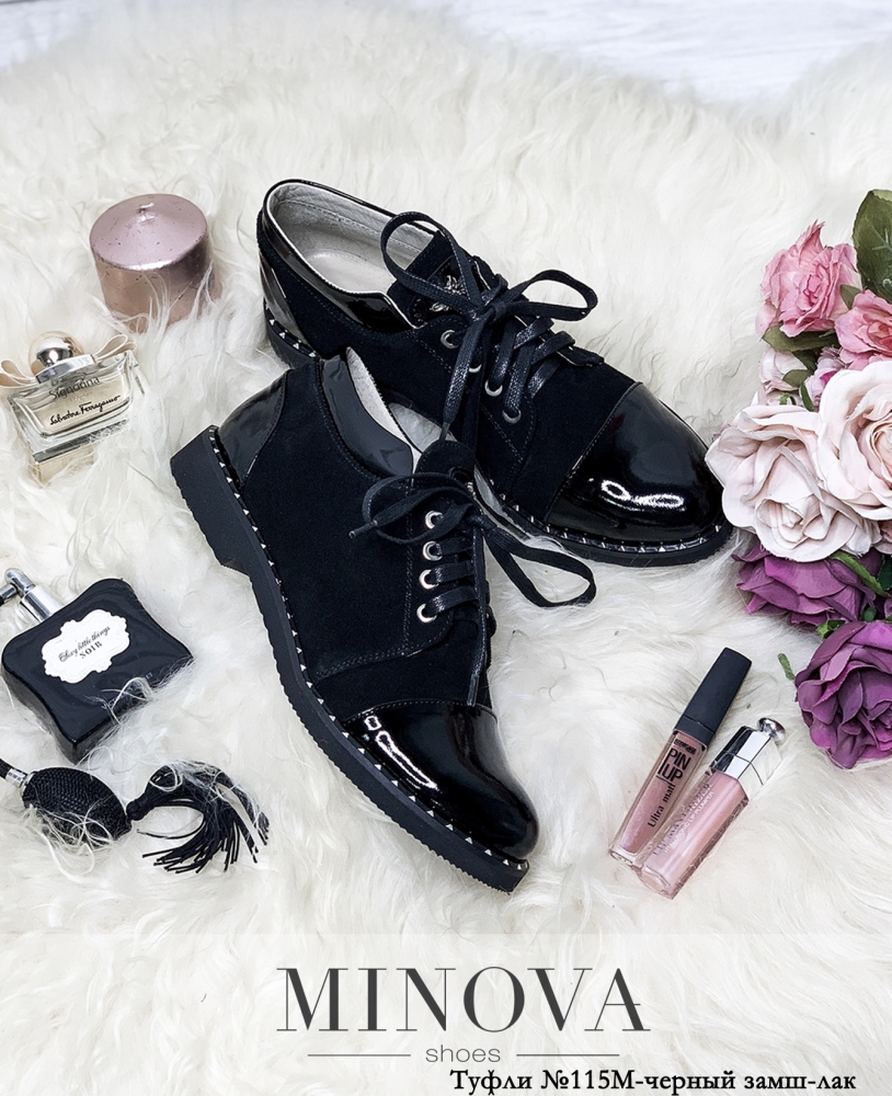 Туфли на шнурках из комбинации замши и лаковой кожи. Носок и пятка выполнены в лаке. Язычок украшен декоративной деталью. Подошва оформлена рантом.