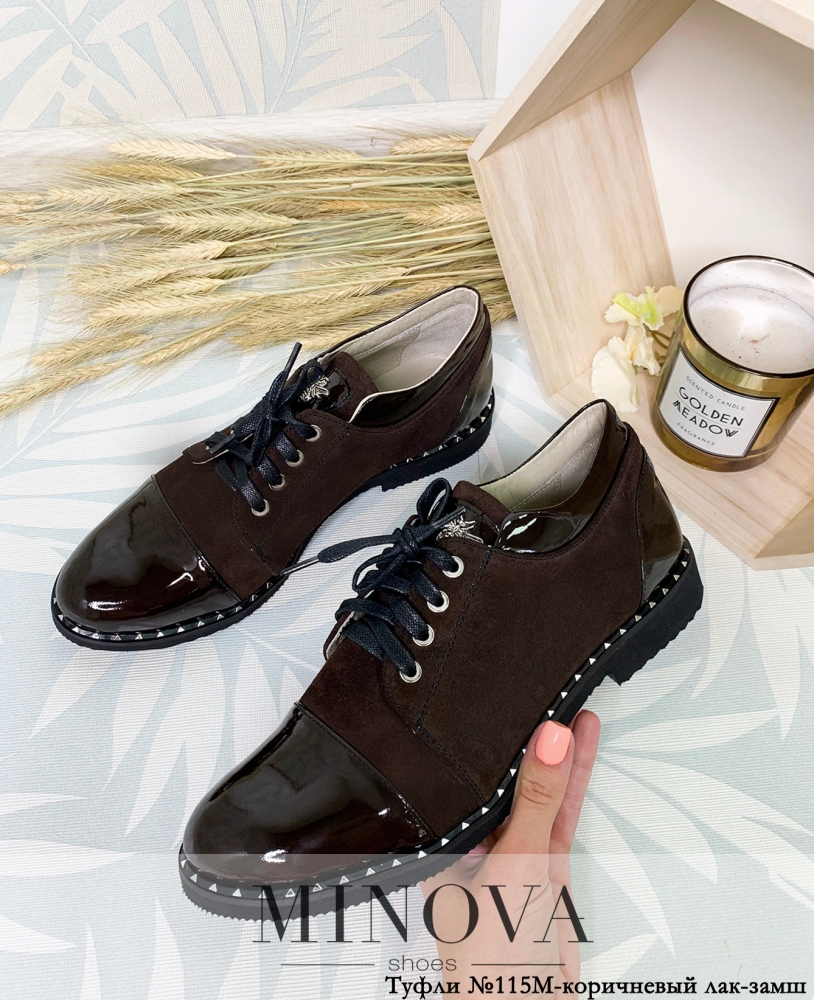 Аккуратные и стильные ботинки из новой коллекции женской обуви Minova понравятся девушкам, которые предпочитают оригинальную обувь. Ботинки из натуральной кожи, с небольшим каблучком на подошве, носок и задник лакированные, а язычок – из блестящей кожи с лакированной вставкой, украшенной металлической пчёлкой. Штаферка (по верхней части ботинка) тоже закреплена лакированной кожей. По основной части – вставка из блестящей кожи или матового замша. Шнурки широкие, люверсы – металлические. По ранту подошвы – блестящие треугольные заклёпки. Стельки мягкие, подошва прорезиненная. Такие ботинки хорошо подойдут для создания городского стиля. В каталоге вы найдёте коричневый, красный и синий лакированные варианты с замшевыми вставками, а также чёрный с серебром.