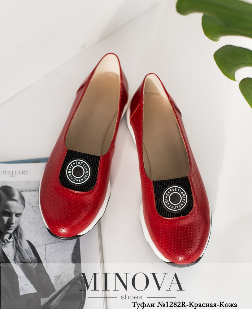 Изящные кожаные туфли с перфорированной поверхностью, на подъёме - декоративная нашивка, подошва волнистая, литая, плотная. Застёжек нет.