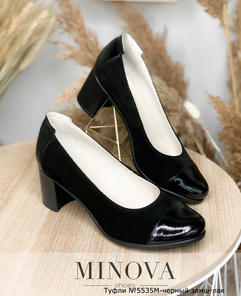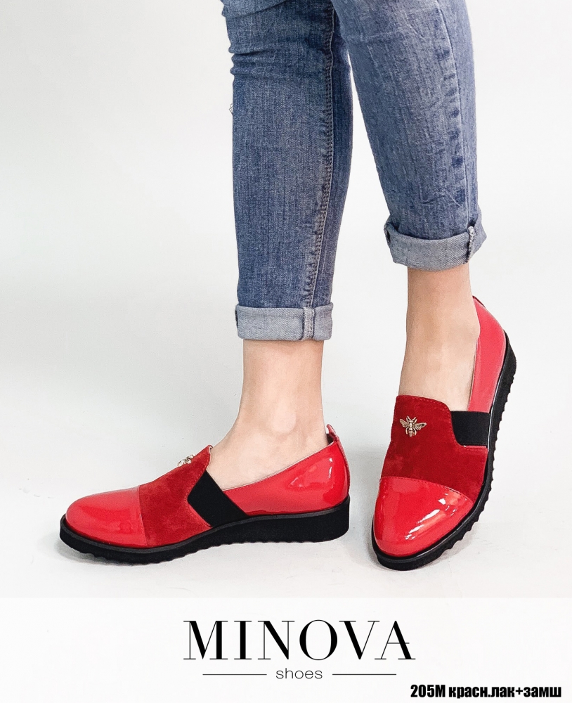 Туфли из комбинации лаковой кожи и замши на утолщенной рифленой подошве. Язычок украшен декоративной металлической деталью в виде пчелки. Для удобства при надевании, туфли оснащены эластичными резинками по бокам.