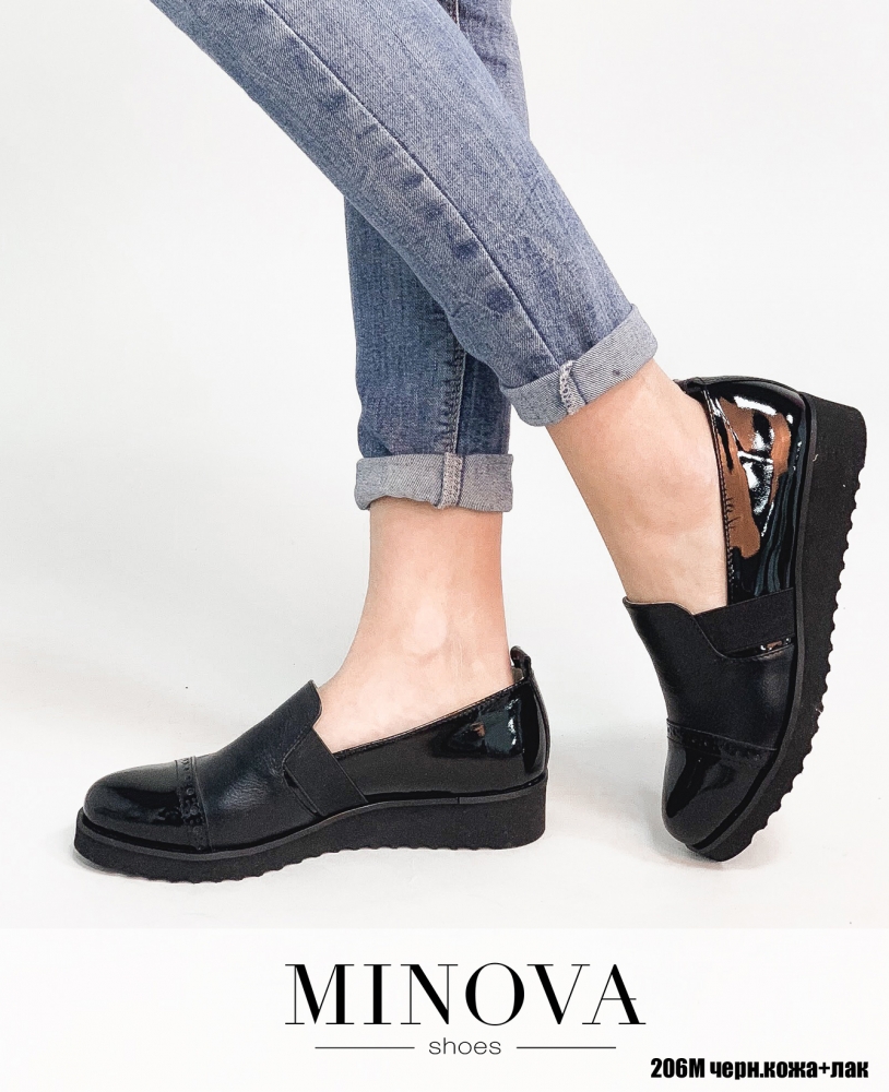 Туфли из комбинации лаковой кожи и гладкой кожи на утолщенной рифленой подошве. Носочек украшен брогированием. Для удобства при надевании, туфли оснащены эластичными резинками по бокам.