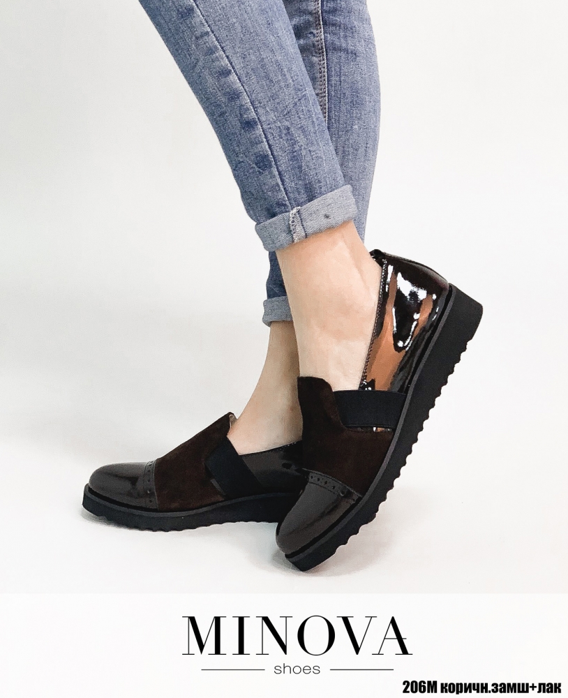 Туфли из комбинации лаковой кожи и замши на утолщенной рифленой подошве. Носочек украшен брогированием. Для удобства при надевании, туфли оснащены эластичными резинками по бокам.